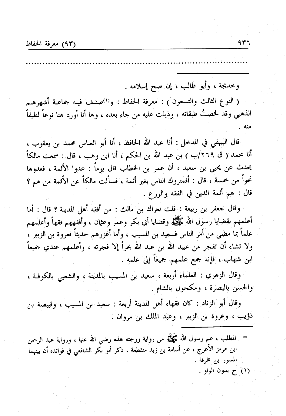 قَالَ الْبَيْهَقِيُّ فِي الْمَدْخَلِ: أَنَا عَبْدُ اللَّهِ الْحَافِظُ، أَنَا أَبُو الْعَبَّاسِ مُحَمَّدُ بْنُ يَعْقُوبَ، أَنَا مُحَمَّدُ بْنُ عَبْدِ اللَّهِ بْنِ الْحَكَمِ أَنَا ابْنُ وَهْبٍ، قَالَ: سَمِعْتُ مَالِكًا يُحَدِّثُ عَنْ يَحْيَى بْنِ سَعِيدٍ، أَنَّ عُمَرَ بْنَ الْخَطَّابِ قَالَ يَوْمًا: عُدُّوا الْأَئِمَّةَ، فَعَدُّوهَا نَحْوًا مِنْ خَمْسَةٍ، قَالَ: أَفَمُتْرُوكٌ النَّاسَ بِغَيْرِ أَئِمَّةٍ، فَسَأَلْتُ مَالِكًا عَنِ الْأَئِمَّةِ مَنْ هُمْ؟ قَالَ: هُمْ أَئِمَّةُ الدِّينِ فِي الْفِقْهِ وَالْوَرَعِ.