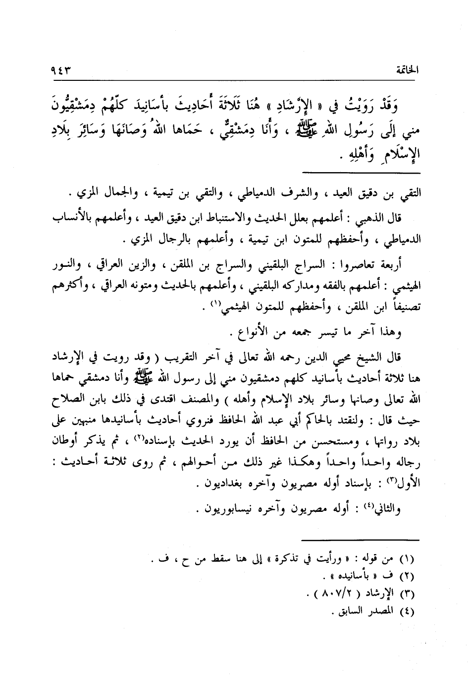 وَقَدْ رَوَيْتُ فِي الْإِرْشَادِ هُنَا ثَلَاثَةَ أَحَادِيثَ بِأَسَانِيدَ كُلُّهُمْ دِمَشْقِيُّونَ مِنِّي إِلَى رَسُولِ اللَّهِ - صَلَّى اللَّهُ عَلَيْهِ وَسَلَّمَ - وَأَنَا دِمَشْقِيٌّ حَمَاهَا اللَّهُ تَعَالَى وَصَانَهَا وَسَائِرَ بِلَادِ الْإِسْلَامِ وَأَهْلِهِ.