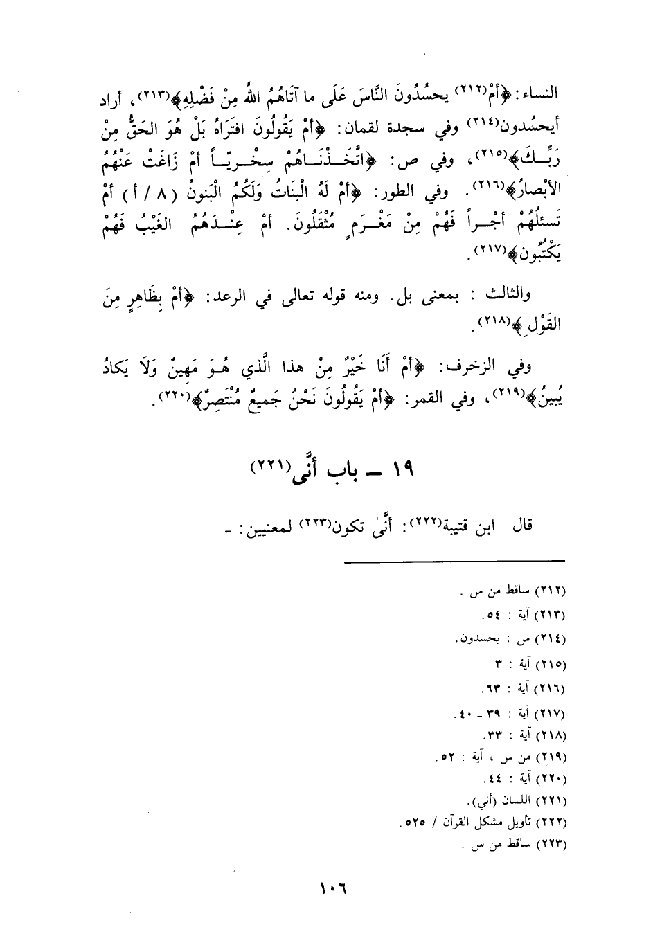 النِّسَاء: {أم يحسدون النَّاس على مَا آتَاهُم الله من فَضله} ، أَرَادَ أيحسدون وَفِي سَجْدَة لُقْمَان: {أم يَقُولُونَ افتراه بل هُوَ الْحق من رَبك} ، وَفِي ص: {أتخذناهم سخريا أم زاغت عَنْهُم الْأَبْصَار} . وَفِي الطّور: {أم لَهُ الْبَنَات وَلكم البنون (8 / أ} أم تسئلهم أجرا فهم من مغرم مثقلون. أم عِنْدهم الْغَيْب فهم يَكْتُبُونَ} .