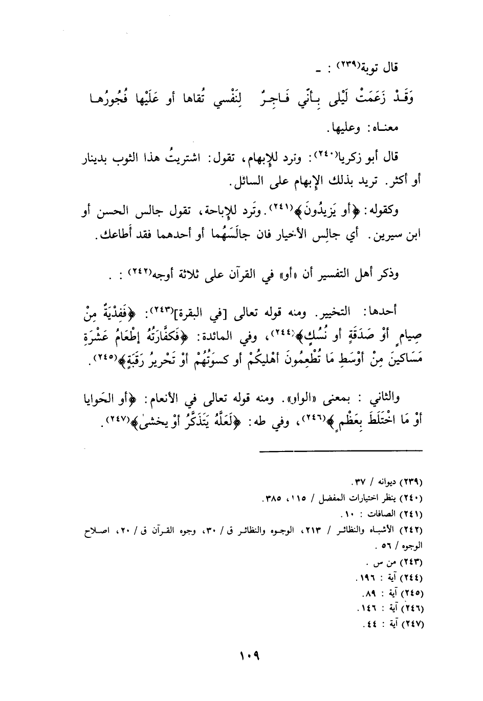 وَذكر أهل التَّفْسِير أَن " أَو " فِي الْقُرْآن على ثَلَاثَة أوجه: