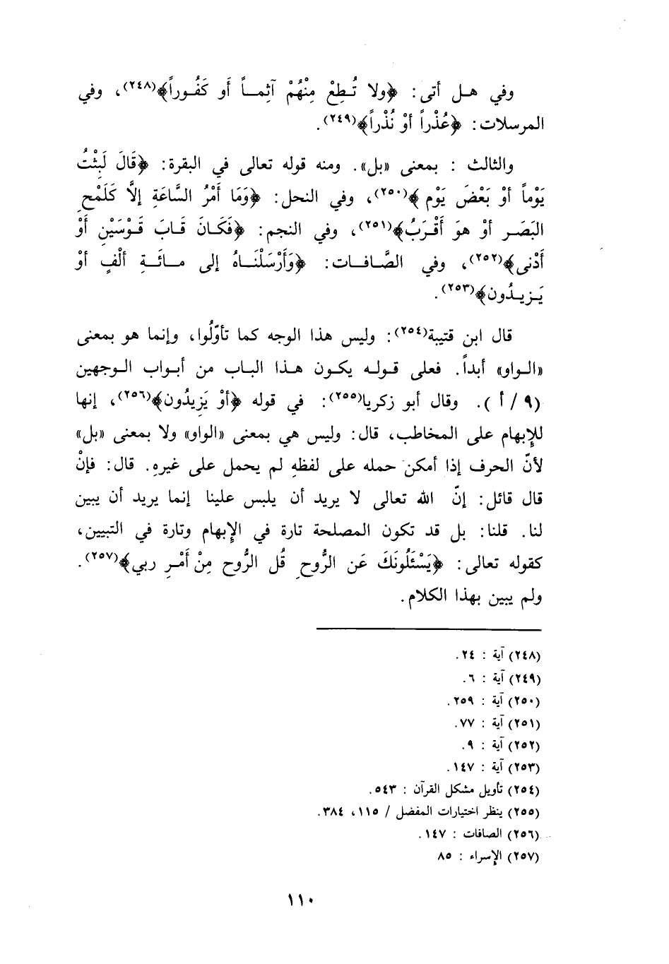 قَالَ ابْن قُتَيْبَة: وَلَيْسَ هَذَا الْوَجْه كَمَا تأولوا، وَإِنَّمَا هُوَ بِمَعْنى " الْوَاو " أبدا. فعلى قَوْله يكون هَذَا الْبَاب من أَبْوَاب الْوَجْهَيْنِ (9 / أ) . وَقَالَ أَبُو زَكَرِيَّا: فِي قَوْله {أَو يزِيدُونَ} ، إِنَّهَا للإبهام على الْمُخَاطب، قَالَ: وَلَيْسَ هِيَ بِمَعْنى " الْوَاو " وَلَا بِمَعْنى " بل " لِأَن الْحَرْف إِذا أمكن حمله على لَفظه لم يحمل على غَيره. قَالَ: فَإِن قَالَ قَائِل: إِن الله تَعَالَى لَا يُرِيد أَن يلبس علينا إِنَّمَا يُرِيد أَن يبين لنا. قُلْنَا: بل قد تكون الْمصلحَة تَارَة فِي الْإِبْهَام وَتارَة فِي التَّبْيِين، كَقَوْلِه تَعَالَى: {يسئلونك عَن الرّوح قل الرّوح من أَمر رَبِّي} . وَلم يبين بِهَذَا الْكَلَام.