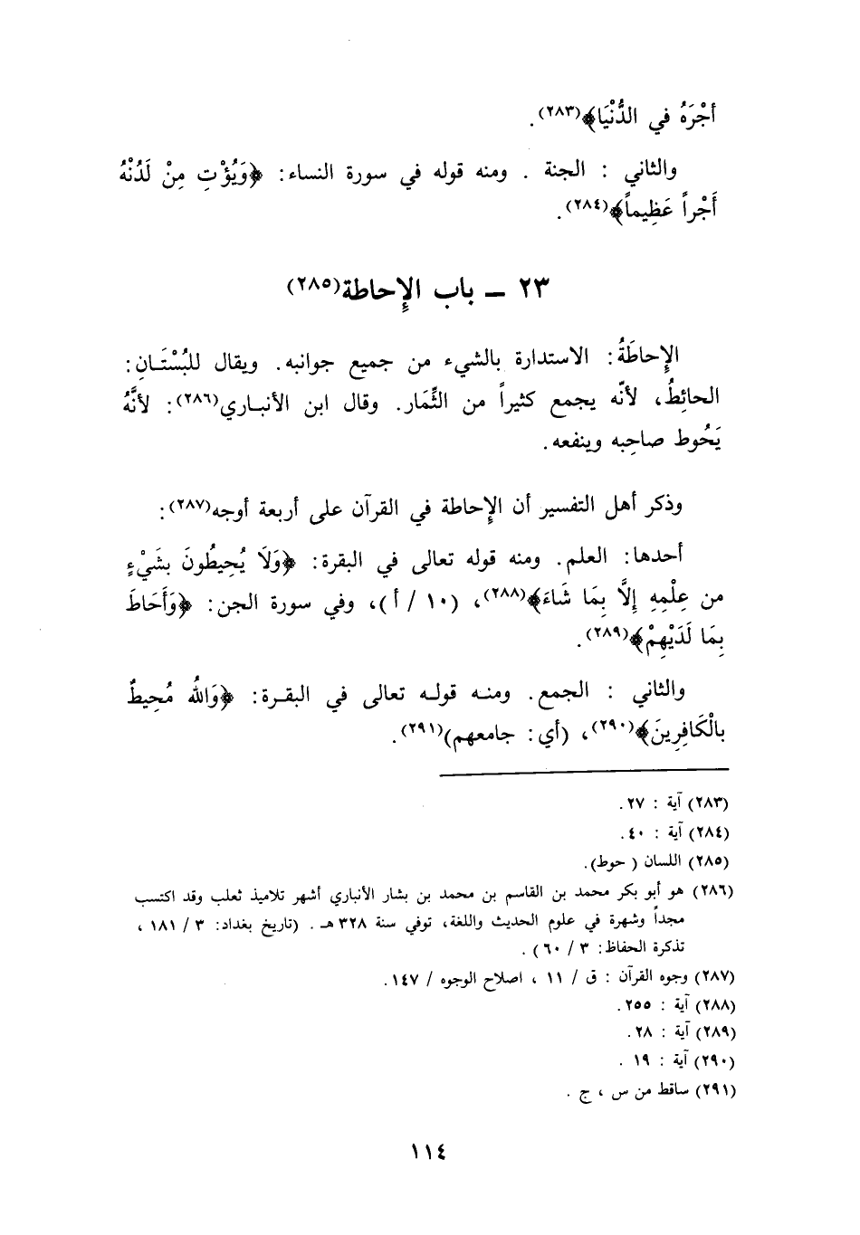 وَذكر أهل التَّفْسِير أَن الْإِحَاطَة فِي الْقُرْآن على أَرْبَعَة أوجه: