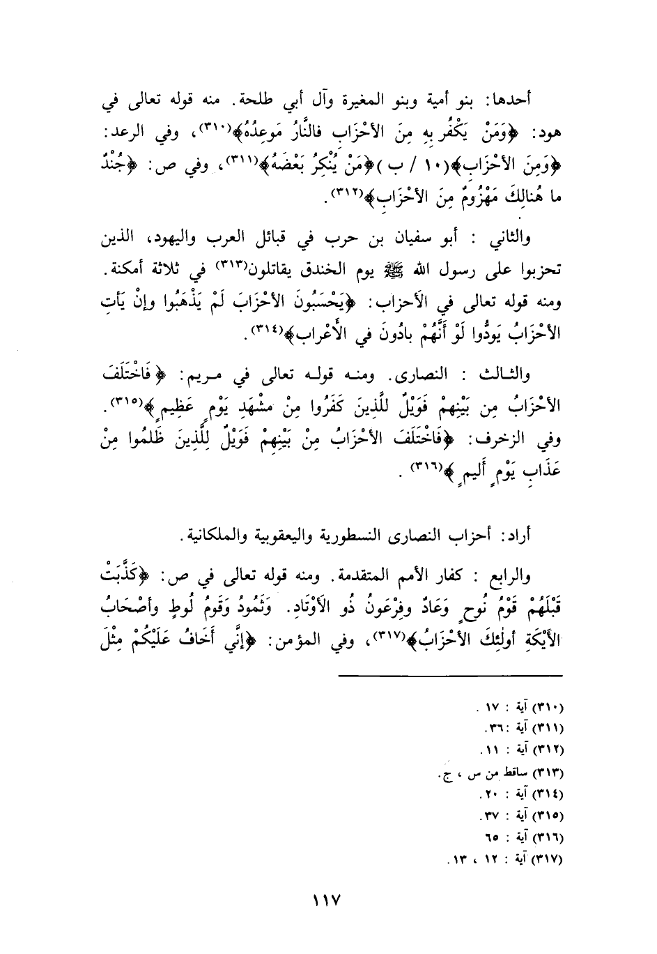 أَحدهَا: بَنو أُميَّة وَبَنُو الْمُغيرَة وَآل أبي طَلْحَة. مِنْهُ قَوْله تَعَالَى فِي هود: {وَمن يكفر بِهِ من الْأَحْزَاب فَالنَّار موعده} ، وَفِي الرَّعْد: {وَمن الْأَحْزَاب} {10 / ب} {من يُنكر بعضه} ، وَفِي ص: {جند مَا هُنَالك مهزوم من الْأَحْزَاب} .