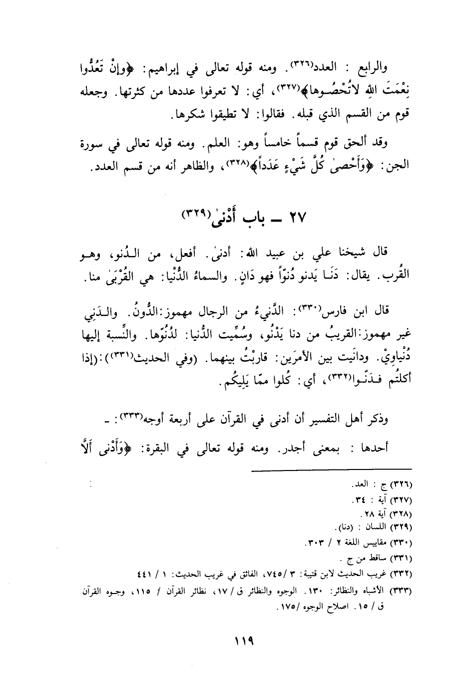 وَذكر أهل التَّفْسِير أَن أدنى فِي الْقُرْآن على أَرْبَعَة أوجه: -
