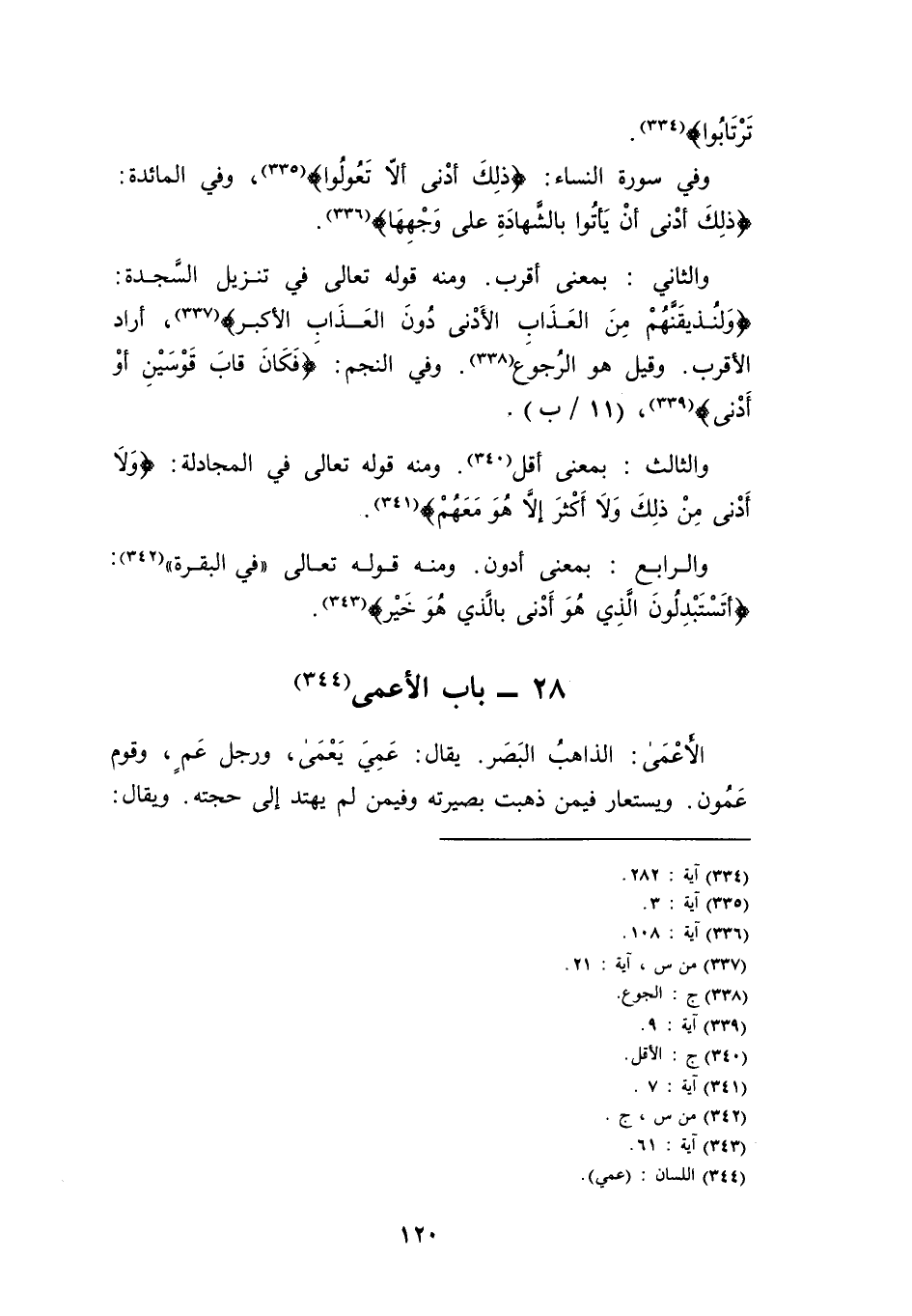 وَالثَّانِي: بِمَعْنى أقرب. وَمِنْه قَوْله تَعَالَى فِي تَنْزِيل السَّجْدَة: {ولنذيقنهم من الْعَذَاب الْأَدْنَى دون الْعَذَاب الْأَكْبَر} ، أَرَادَ الْأَقْرَب. وَقيل هُوَ الرُّجُوع. وَفِي النَّجْم: {فَكَانَ قاب قوسين أَو أدنى} ، (11 / ب) .