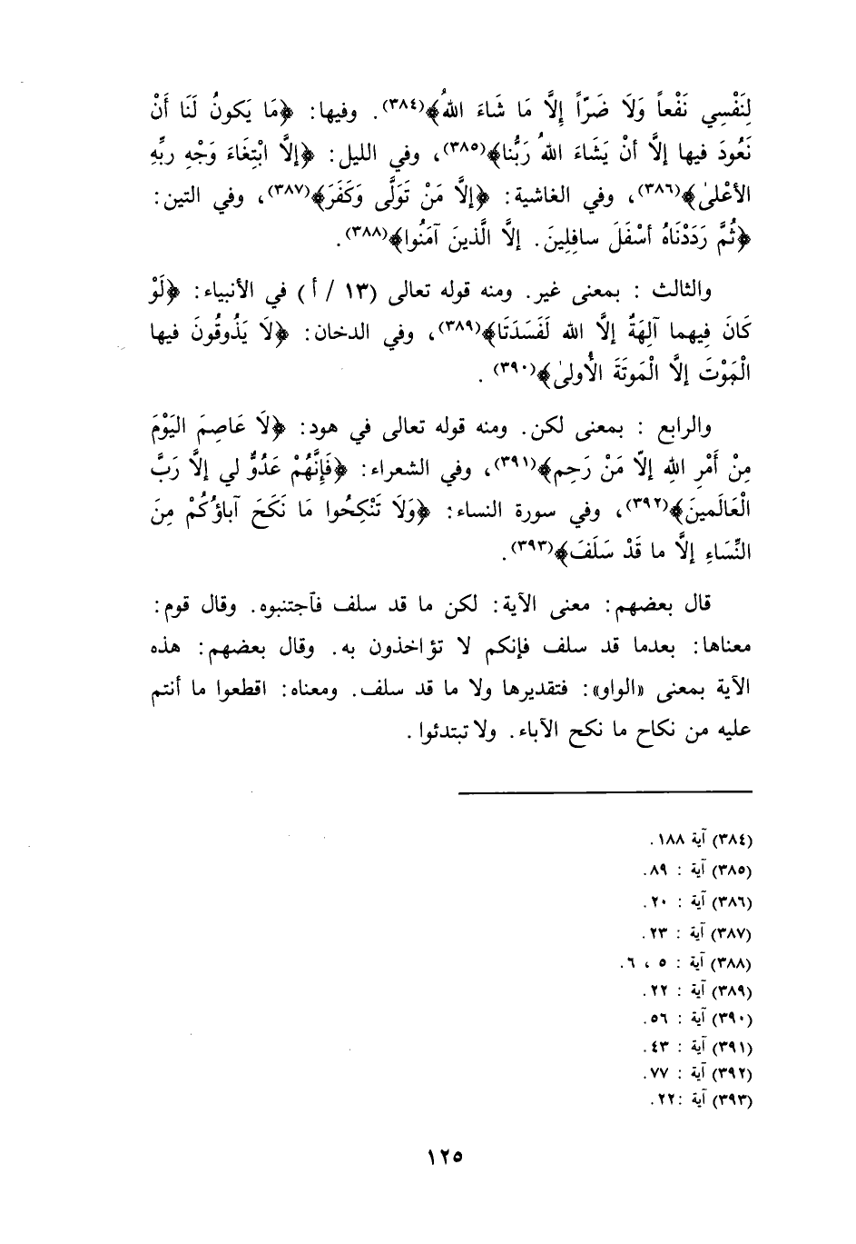لنَفْسي نفعا وَلَا ضرا إِلَّا مَا شَاءَ الله) {وفيهَا} (مَا يكون لنا أَن نعود فِيهَا إِلَّا أَن يَشَاء الله رَبنَا} ، وَفِي اللَّيْل: {إِلَّا ابْتِغَاء وَجه ربه الْأَعْلَى} ، وَفِي الغاشية: {إِلَّا من تولى وَكفر} ، وَفِي التِّين: {ثمَّ رددناه أَسْفَل سافلين. إِلَّا الَّذين آمنُوا} .