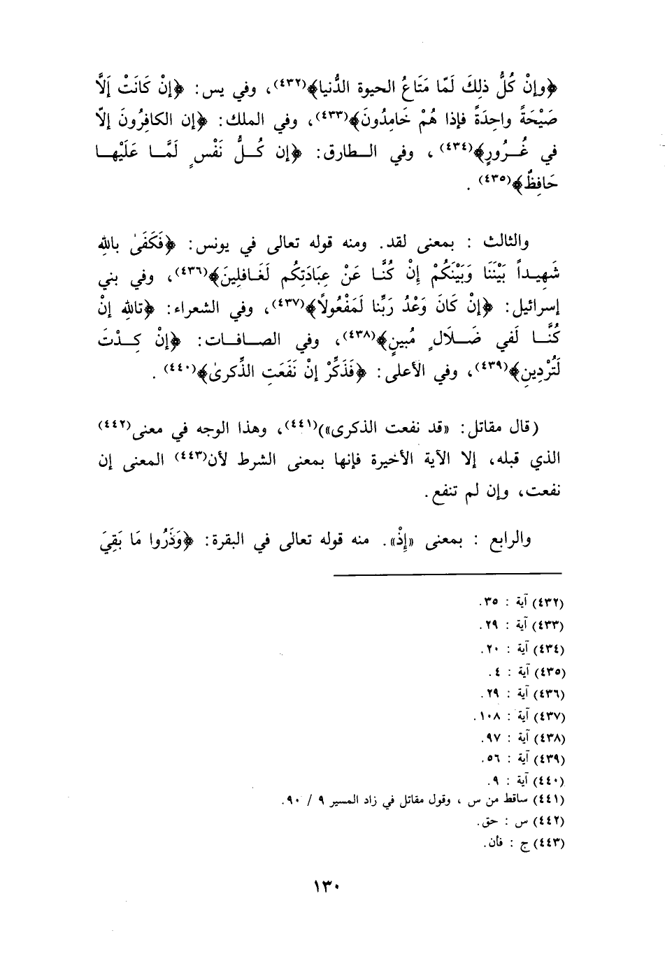 وَالثَّالِث: بِمَعْنى لقد. وَمِنْه قَوْله تَعَالَى فِي يُونُس: {فَكفى بِاللَّه شَهِيدا بَيْننَا وَبَيْنكُم إِن كُنَّا عَن عبادتكم لغافلين} ، وَفِي بني أسرائيل: {إِن كَانَ وعد رَبنَا لمفعولا} ، وَفِي الشُّعَرَاء: {تالله إِن كُنَّا لفي ضلال مُبين} ، وَفِي الصافات: {إِن كدت لتردين} ، وَفِي الْأَعْلَى: {فَذكر إِن نَفَعت الذكرى} .