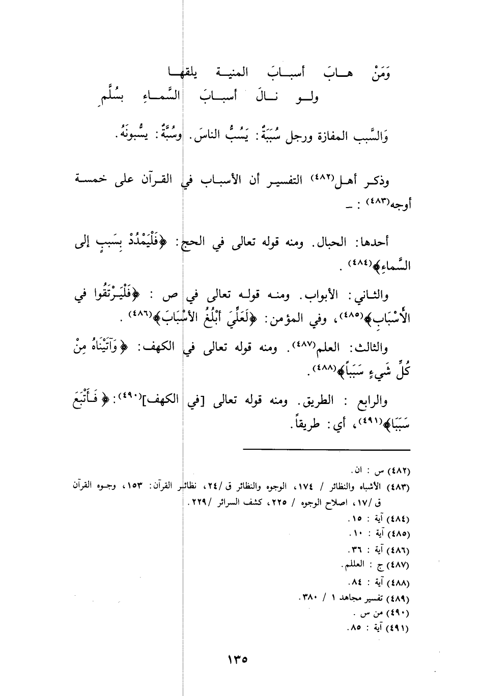 وَذكر أهل التَّفْسِير أَن الْأَسْبَاب فِي الْقُرْآن على خَمْسَة أوجه: -