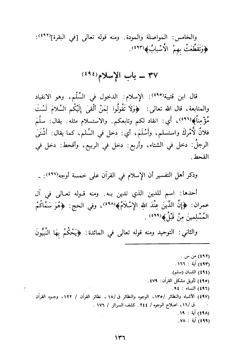 وَذكر أهل التَّفْسِير أَن الْإِسْلَام فِي الْقُرْآن على خَمْسَة أوجه: -