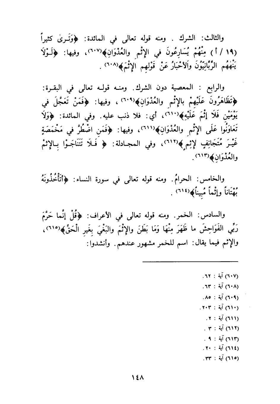 وَالثَّالِث: الشّرك. وَمِنْه قَوْله تَعَالَى فِي الْمَائِدَة: {وَترى كثيرا (19 / أ} مِنْهُم يُسَارِعُونَ فِي الْإِثْم والعدوان} ، وفيهَا: {لَوْلَا ينههم الربانيون والأحبار عَن قَوْلهم الْإِثْم} .