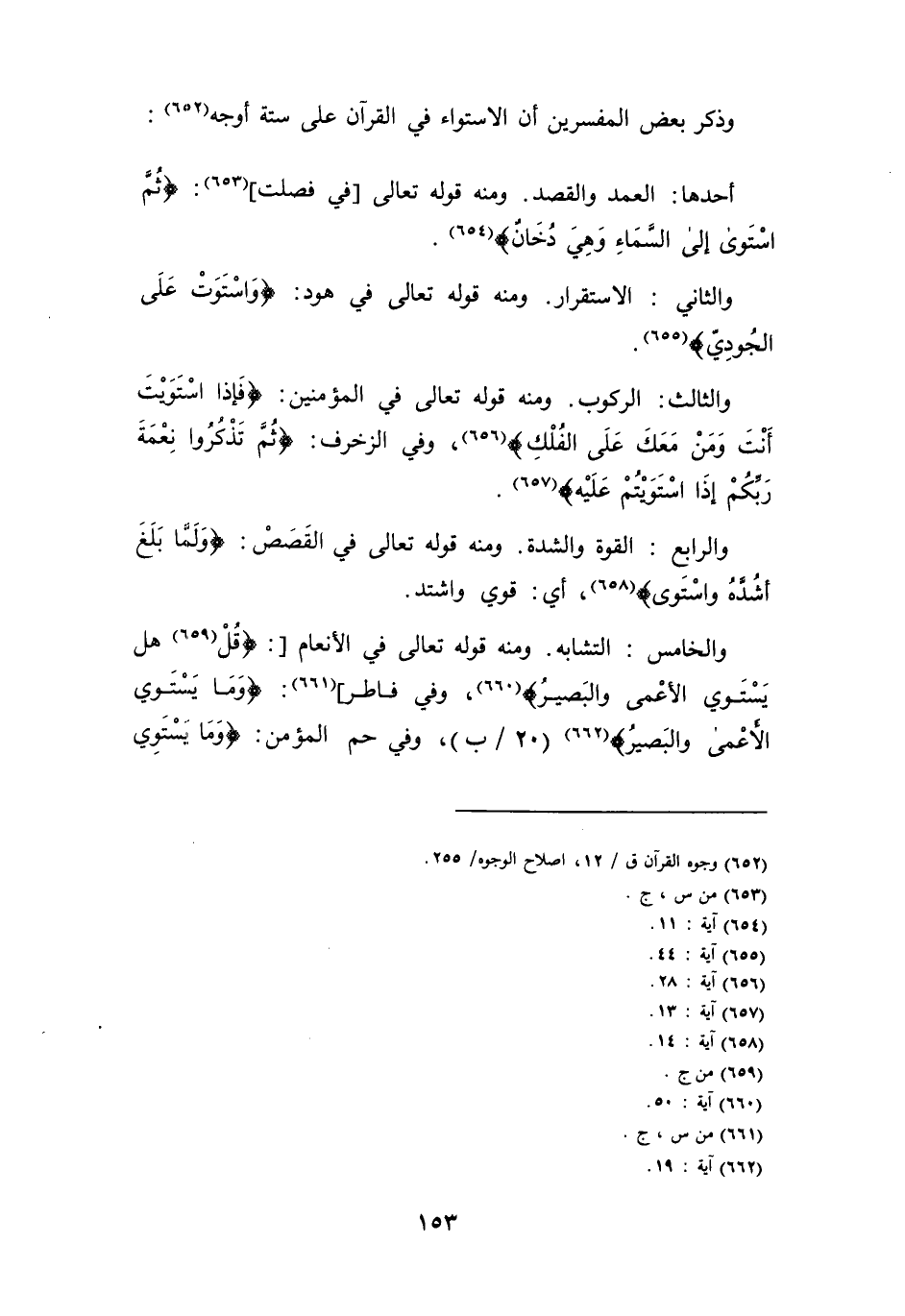 وَذكر بعض الْمُفَسّرين أَن الاسْتوَاء فِي الْقُرْآن على سِتَّة أوجه: