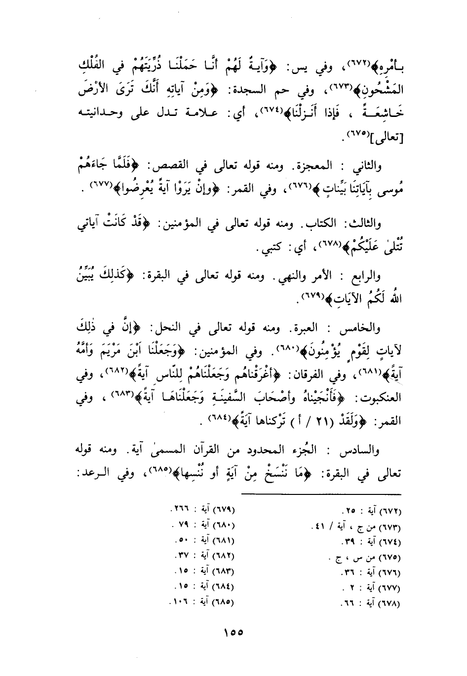 وَالسَّادِس: الْجُزْء الْمَحْدُود من الْقُرْآن الْمُسَمّى آيَة. وَمِنْه قَوْله تَعَالَى فِي الْبَقَرَة: {مَا ننسخ من آيَة أَو ننسها} ، فِي الرَّعْد: