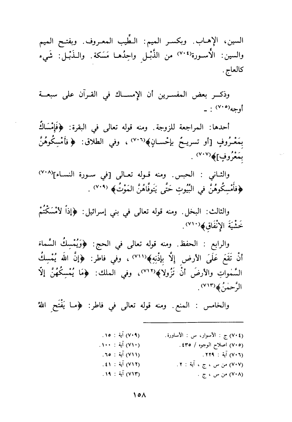 وَذكر بعض الْمُفَسّرين أَن الْإِمْسَاك فِي الْقُرْآن على سَبْعَة أوجه: -