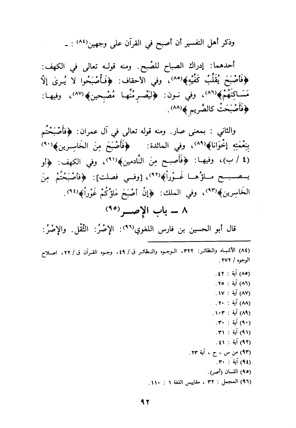 أَحدهمَا: إِدْرَاك الصَّباح للصبح. وَمِنْه قَوْله تَعَالَى فِي الْكَهْف: {فَأصْبح يقلب كفيه} ، وَفِي الْأَحْقَاف: {فَأَصْبحُوا لَا يرى إِلَّا مساكنهم} ، وَفِي نون: {ليصرمنها مصبحين} ، وفيهَا: {فَأَصْبَحت كالصريم} .