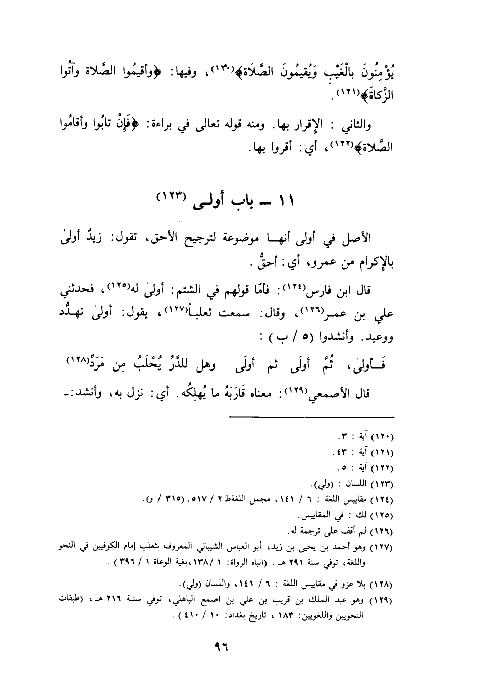 قَالَ ابْن فَارس: فَأَما قَوْلهم فِي الشتم: أولى لَهُ، فَحَدثني على بن عمر، وَقَالَ: سَمِعت ثعلبا، يَقُول: أولى تهدد ووعيد. وأنشدوا (5 / ب) :