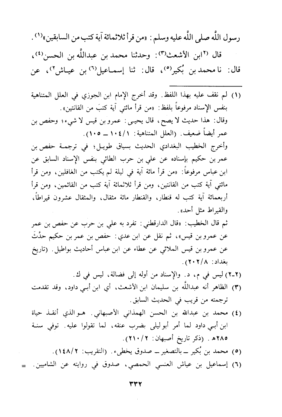 رسول الله صلى اللَّه عليه وسلم: "من قرأ ثلاثمائة آية كتب من السابقين ".