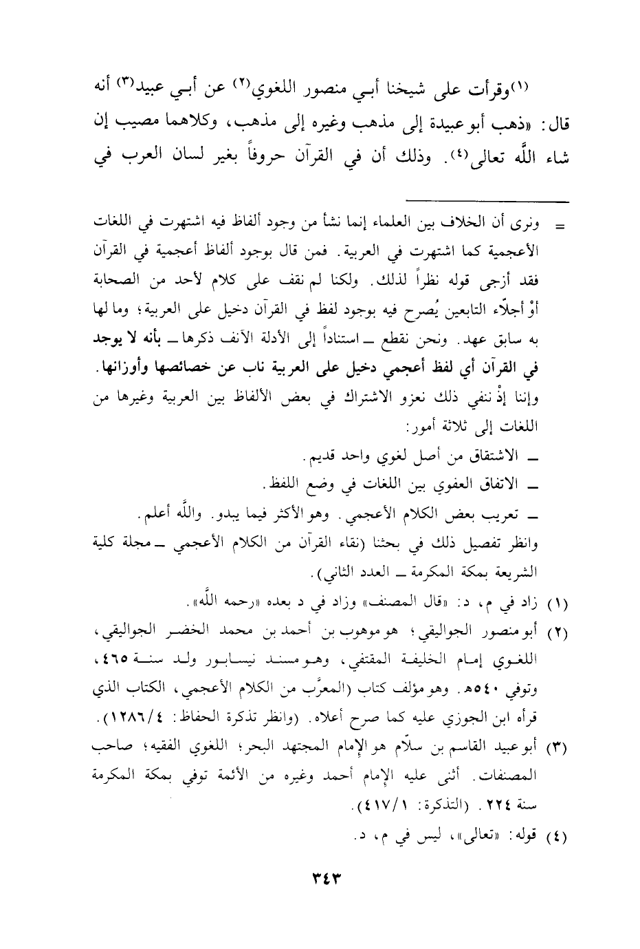 وقرأت على شيخنا أبي منصور اللغوي عن أبي عبيد أنه قال