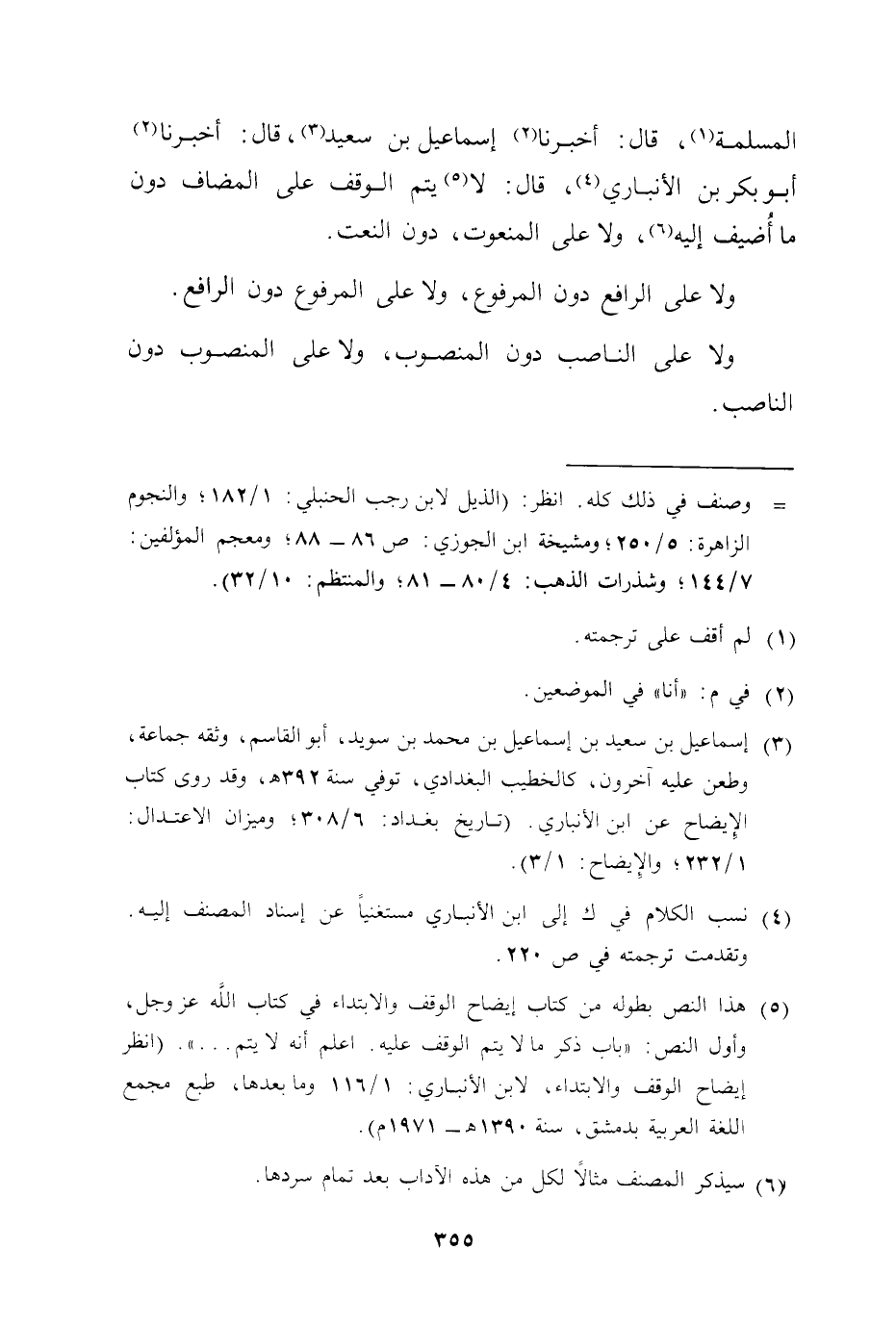 أبو بكر بن الأنباري، قال: لا يتم الوقف على المضاف دون