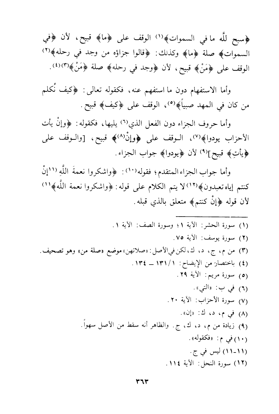 وأما الاستفهام دون ما استفهم عنه، فكقوله تعالى: (كيف نُكلم