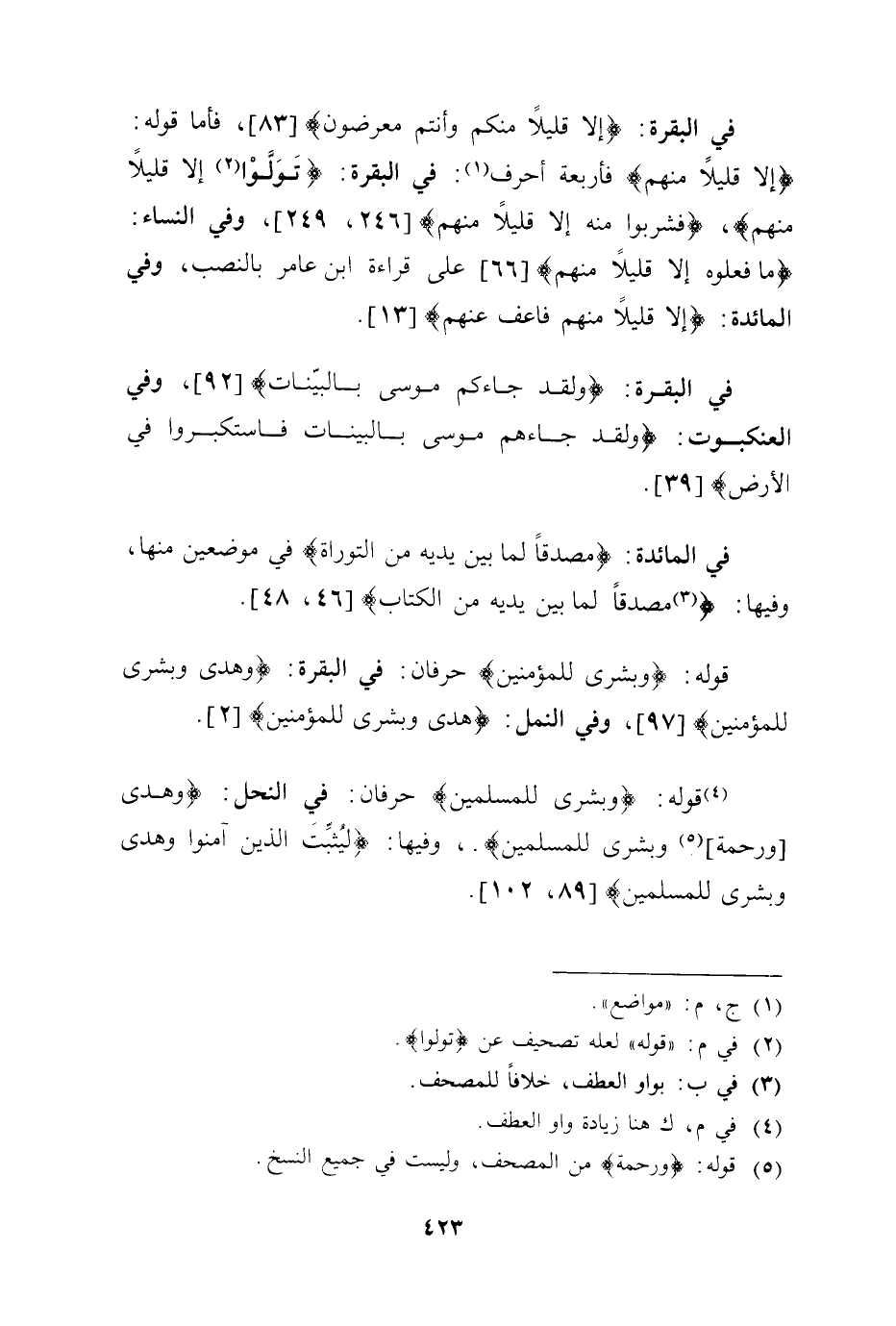 قوله: (وبشرى للمسلمين) حرفان: في النحل: (وهدى ورحمة وبشرى للمسلمين) .، وفيها: (ليُثبِّتَ الذين آمنوا وهدى وبشرى للمسلمين) .