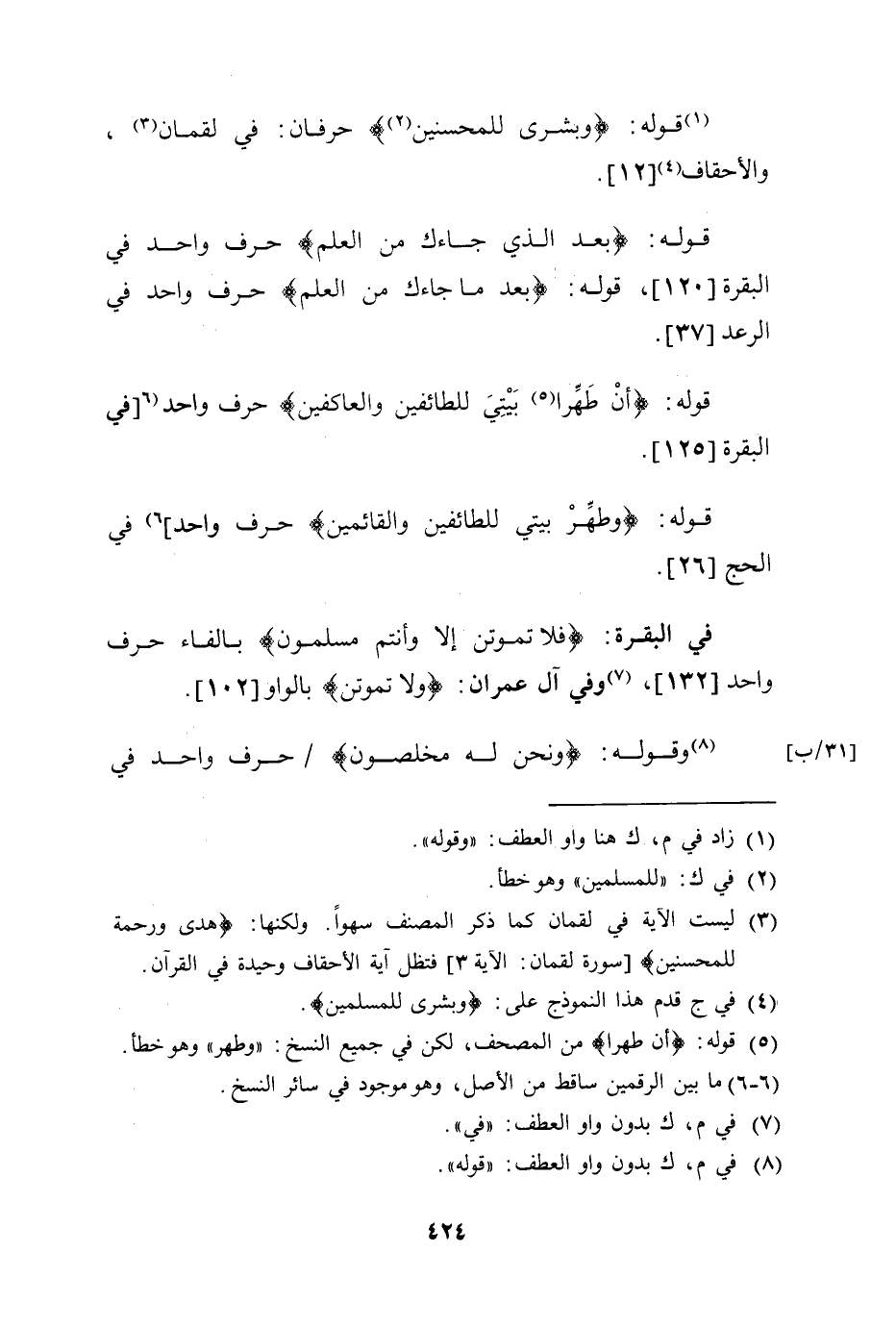 قوله: (وبشرى للمحسنين) حرفان: في لقمان والأحقاف.