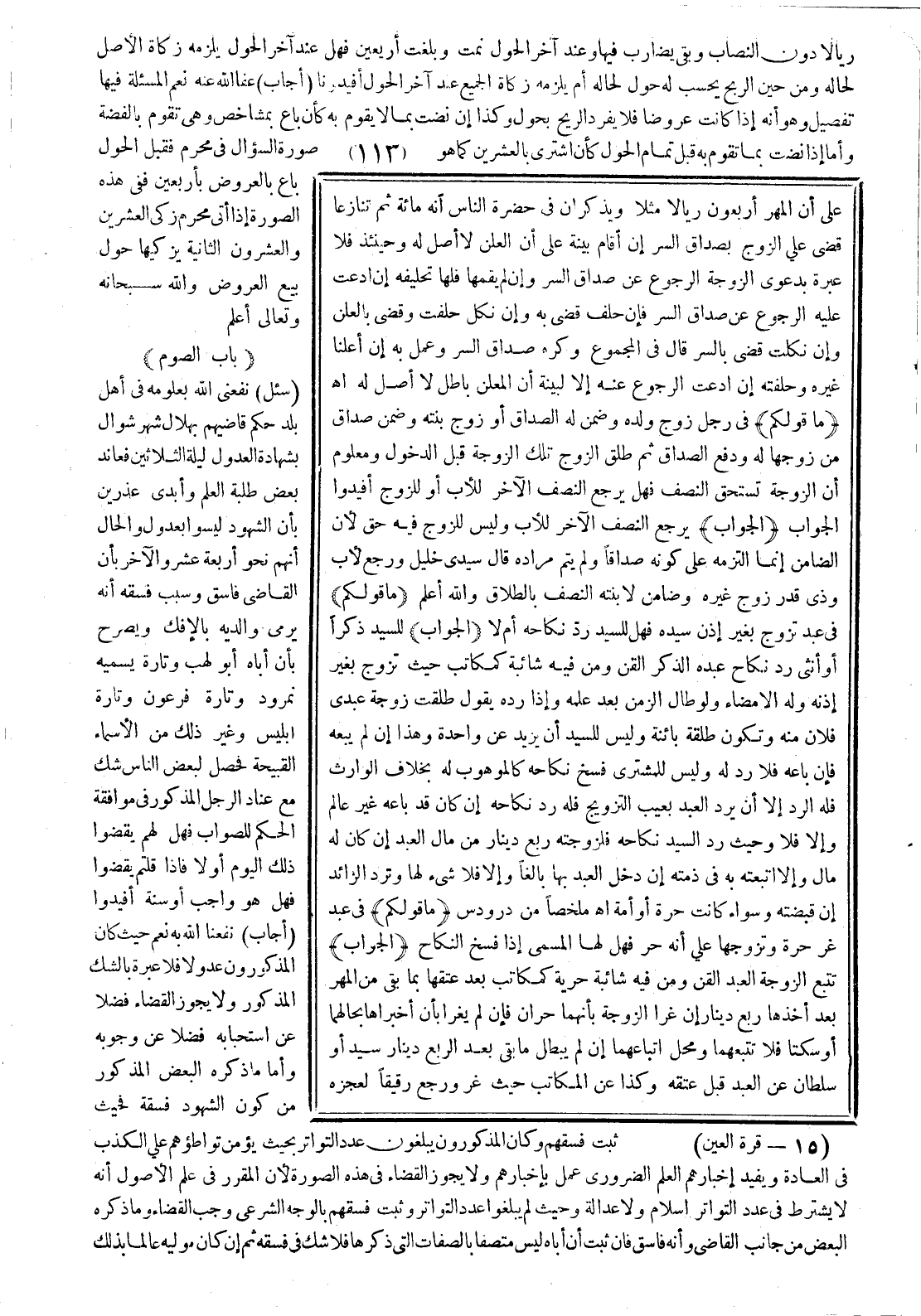 (ما قولكم) في عبد تزوج بغير إذن سيده فهل للسيد رد نكاح عبده الذكر القن ومن فيه شائبة كمكاتب حيث تزوج بغير إذنه، وله الإمضاء ولو طال الزمن بعد علمه، وإذا رده يقول: طلقت زوجة عبدي فلان منه، وتكون طلقة بائنة وليس للسيد أن يزيد عن واحدة، وهذا إن لم يبعه فإن باعه فلا رد له. وليس للمشتري فسخ نكاحه كالموهوب له، بخلاف الوارث فله الرد إلا أن يرد العبد بعيب التزويج فله رد نكاحه إن كان قد باعه غير عالم وإلا فلا. وحيث رد السيد نكاحه فلزوجته ربع دينار من مال العبد إن كان له مال وإلا اتبعته به في ذمته إن دخل العبد بها بالغا، وإلا فلا شيء لها وترد الزائد إن قبضته وسواء كانت حرة أو أمة. اهـ ملخصا من در ودس.