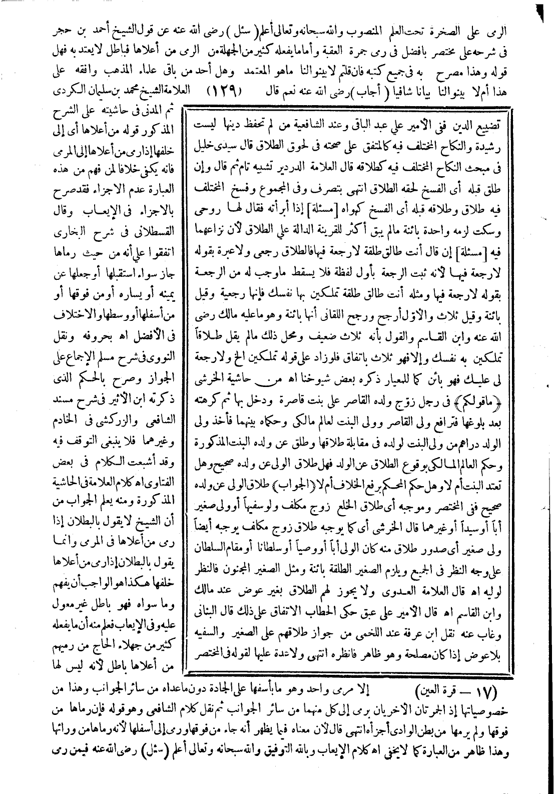 (ما قولكم) في رجل زوج ولده القاصر على بنت قاصرة ودخل بها ثم كرهته بعد بلوغها فترافع ولي القاصر وولي البنت لعالم مالكي، وحكماه بينهما فأخذ ولي الولد دراهم من ولي البنت لولده في مقابلة طلاقها، وطلق عن ولده البنت المذكورة، وحكم العالم المالكي بوقوع الطلاق عن الولد فهل طلاق الولي عن ولده صحيح وهل تعتد البنت أم لا؟ وهل حكم المحكم برفع الخلاف أم لا؟
