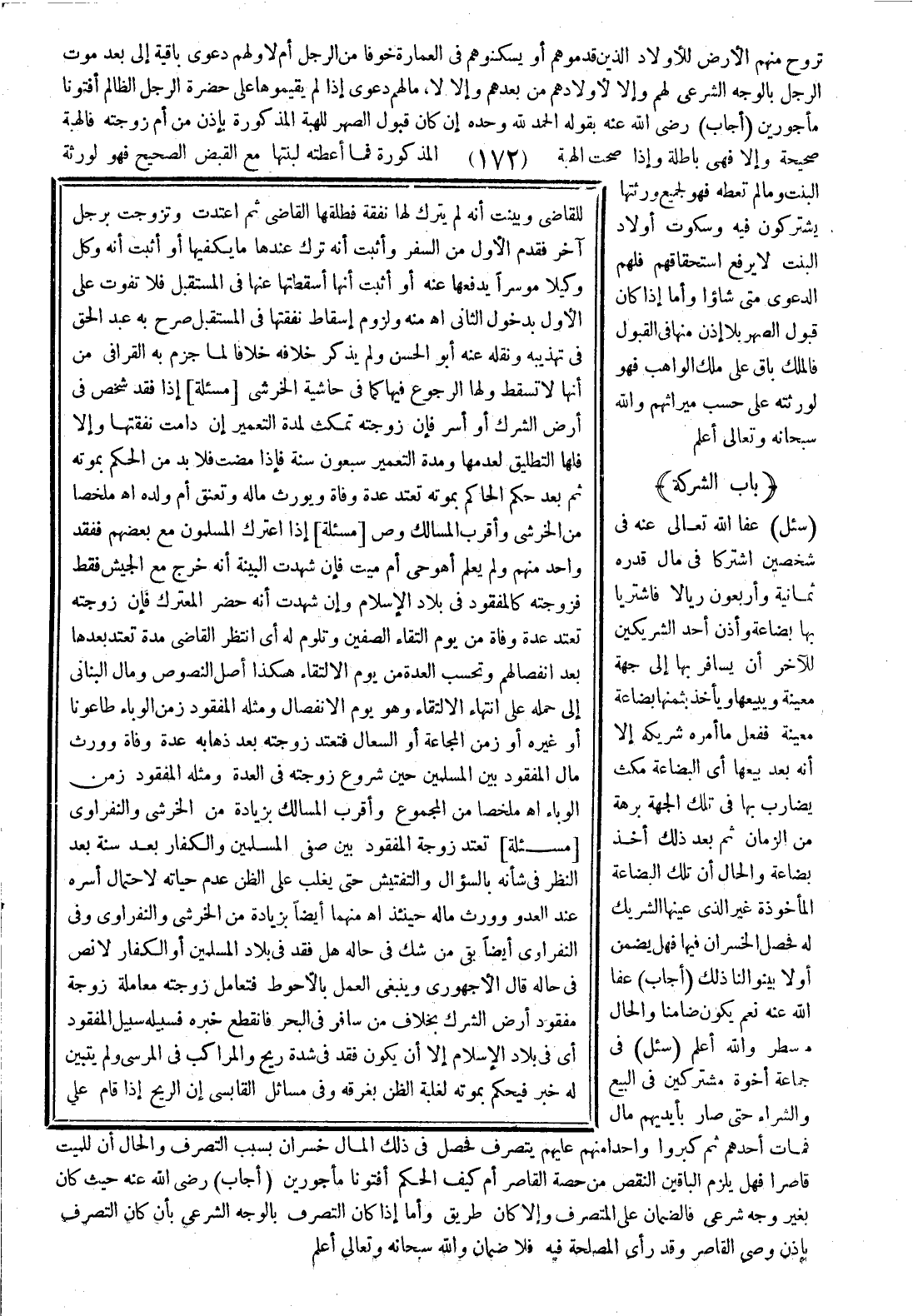 ومال البناني إلى حمله على انتهاء الالتقاء، وهو يوم الانفصال، ومثله المفقود زمن الوباء طاعونًا أو غيره أو زمن المجاعة أو سعال، فتعتد زوجته بعد ذهابه عدة وفاة، وورث مال المفقود بين المسلمين حيث شروع زوجته في العدة، ومثله المفقود زمن الوباء. اهـ ملخصًا من المجموع، وأقرب المسالك بزيادة من الخرشي والنفراوي.