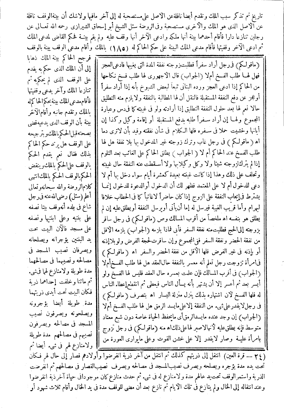 (الجواب) قال الأجهوري: لها طلب فسخ نكاحها من الحاكم إذا ادعى العجز، ورده البناني تبعًا لبعض الشيوخ بأنه إذا أراد سفرًا أو عجز عن دفع النفقة المستقبلة فالنقل أن لها المطالبة بالنفقة ولا يلزم منه التطليق حالاً، نعم لها بعد حلول النفقة التطليق إذا أرادته ولو في غيبته كما في (دس) وعبارة المجموع: ولها إن أراد سفرًا طلبه بدفع المستقبلة أو إقامة وكيل، وكذا إن أبانها وخشيت حملاً في سفره فلها الكلام في شأن نفقته، وقيد بأن لا ترى دمًا. اهـ.