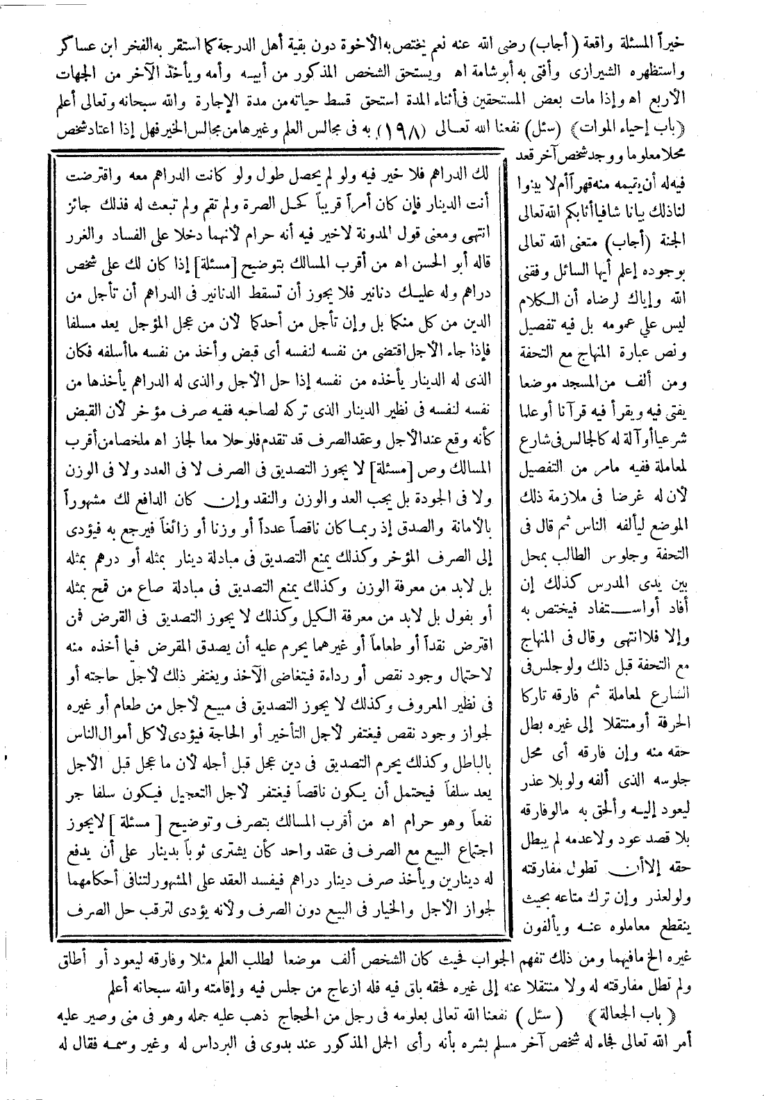 إذا كان لك على شخص دراهم، وله عليك دنانير، فلا يجوز أن تسقط الدنانير في الدراهم أن تأجل من الدين من كل منكما، بل وإن تأجل من أحدكما؛ لأن من عجل المؤجل يعد مسلفا، فإذا جاء الأجل اقتضى من نفسه لنفسه؛ أي قبض وأخذ من نفسه ما أسلفه، فكان الذي له الدينار يأخذه من نفسه إذا حل الأجل، والذي له الدراهم يأخذها من نفسه لنفسه في نظير الدينار الذي تركه لصاحبه، ففيه صرف مؤخر؛ لأن القبض كأنه وقع عند الأجل، وعقد الصرف قد تقدم، فلو حلا معا لجاز. اهـ. ملخصا من أقرب المسالك و "ص".