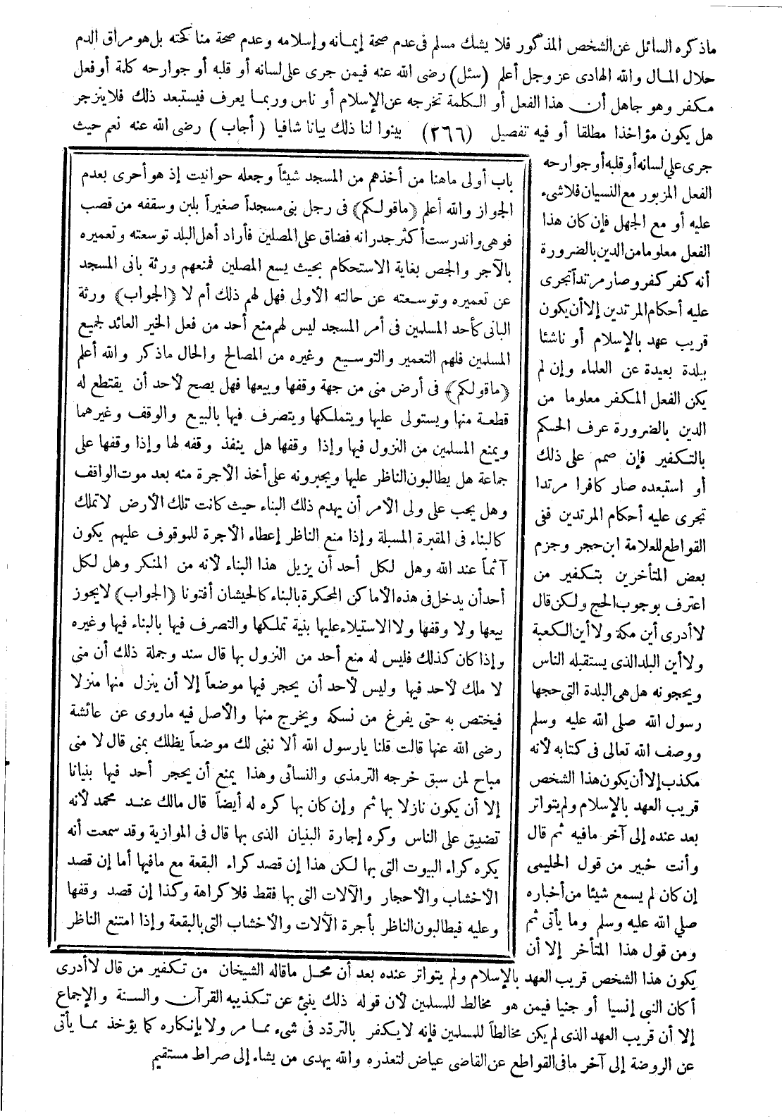 (ما قولكم) في أرض منى من جهة وقفها وبيعها، فهل يصح لأحد أن يقتطع له قطعة منها ويستولي عليها ويتملكها، ويتصرف فيها بالبيع والوقف وغيرهما، ويمنع المسلمين من النزول فيها؟ وإذا وقفها هل ينفذ وقفه لها؟ وإذا وقفها على جماعة هل يطالبون الناظر عليها ويجبرونه على أخذ الأجرة منه بعد موت الواقف؟ وهل يجب على ولي الأمر أن يهدم ذلك البناء حيث كانت تلك الأرض لا تملك كالبناء في المقبرة المسبلة؟ وإذا منع الناظر إعطاء الأجرة للموقوف عليهم يكون آثما عند الله؟ وهل لكل أحد أن يزيل هذا البناء؛ لأنه من المنكر؟ وهل لكل أحد أن يدخل في هذه الأماكن المحكرة بالبناء كالحيشان؟ أفتونا.