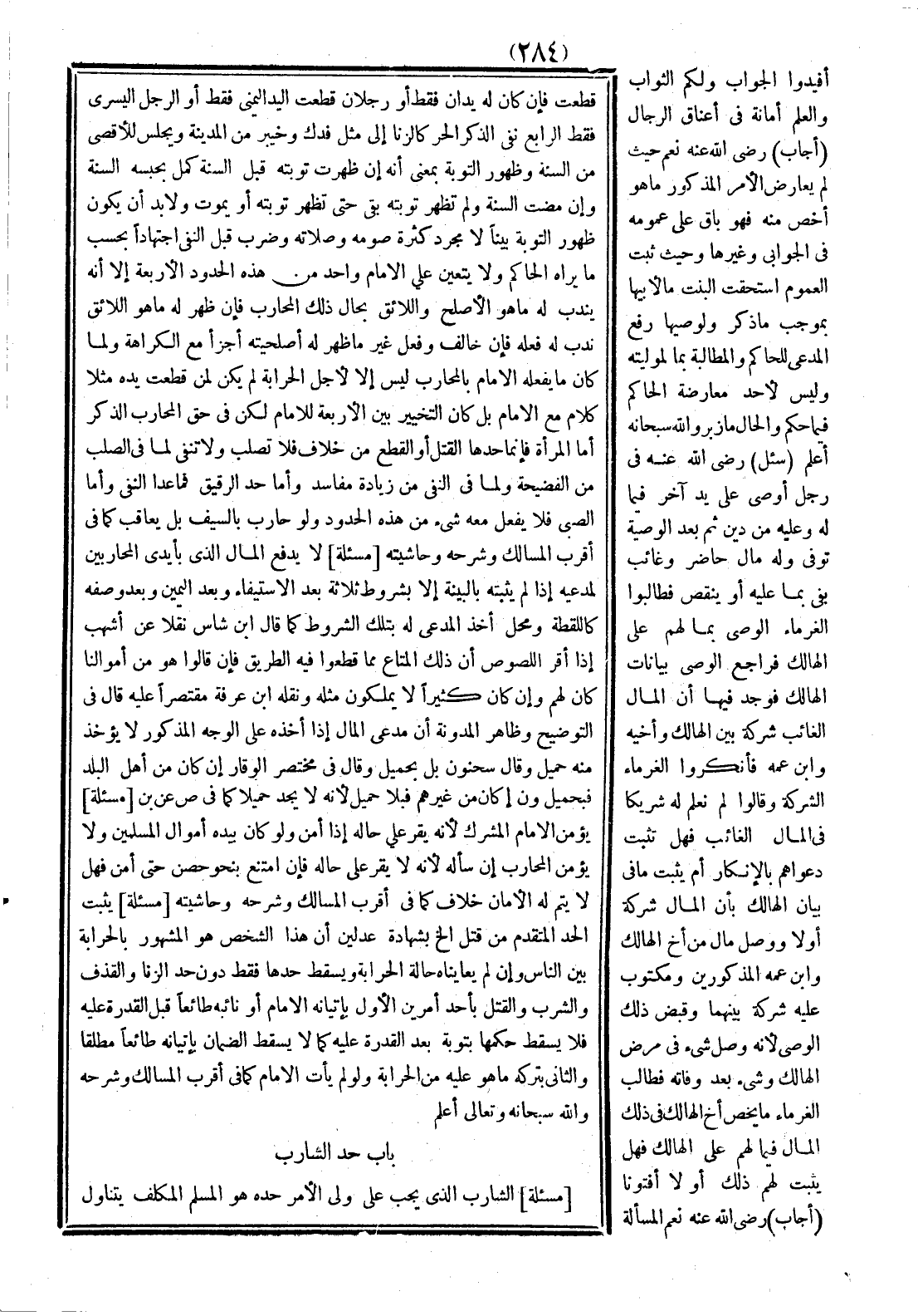 قطعت، فإن كان له يدان فقط أو رجلان قطعت اليد اليمنى فقط أو الرجل اليسرى فقط، الرابع: نفي الذكر الحر -كالزنا- إلى مثل فدك وخيبر من المدينة، ويجلس للأقصى من السنة وظهور التوبة؛ بمعنى أنه إن ظهرت توبته قبل السنة كمل بحبسه السنة، وإن مضت السنة ولم تظهر توبته بقي حتى تظهر توبته أو يموت، ولا بد أن يكون ظهور التوبة بينا لا مجرد كثرة صومه وصلاته، وضرب قبل النفي اجتهادا بحسب ما يراه الحاكم، ولا يتعين على الإمام واحد من هذه الحدود الأربعة، إلا أنه يندب له ما هو الأصلح واللائق بحال ذلك المحارب؛ فإن ظهر له ما هو اللائق ندب له ما فعله، فإن خالف وفعل غير ما ظهر له أصلحيته أجزأ مع الكراهة.