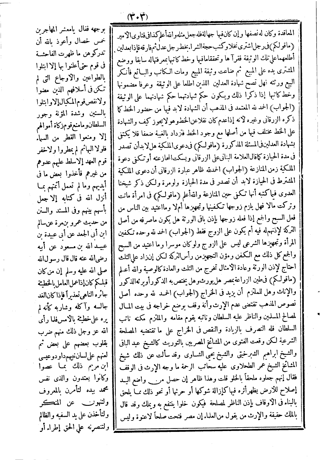 الحمد لله وحده أصل نصوص المذهب تقتضي عدم الإرث، وأنه وقف يوضع خراجه في بيت المال لمصالح المسلمين، والناظر عليه السلطان ونائبه يقوم مقامه، والملتزم مكنه نائب السلطان، فله التصرف بالزيادة والنقص في الخراج على ما تقتضيه المصلحة الشرعية، لكن وقعت الفتوى من المشايخ المصريين بالتوريث كالشيخ عبد الباقي والشيخ إبراهيم الشبرخيتي والشيخ يحيى الشاوي، وقد سألت عن ذلك شيخ المشايخ الشيخ عمر الطحلاوي -عليه سحائب الرحمة- ما وجه الإرث في الوقف؟ فقال: إنهم جعلوه ملحقًا بالخلو، قلت: وهذا ظاهر إن حصل من واضع اليد إصلاح للأرض يظهر أثره فيها كإزالة شوكها أو حرثها أو نحو ذلك مما يلحق بالبناء في الأوقاف بإذن الناظر لمصلحة، فيكون خلوًا ينتفع به ويملك، وقد قال بالملك حقيقة والإرث من يقول من العلماء إن مصر فتحت صلحًا لا عنوة وليس