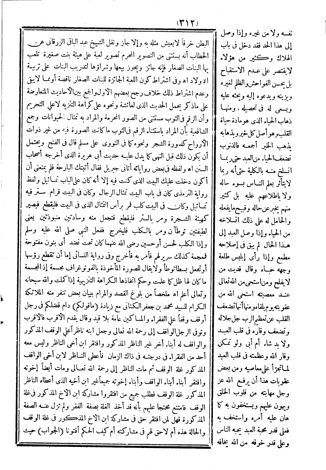 البطن خرقًا لا يعيش مثله به، وإلا جاز، ونقل الشيخ عبد الباقي الزرقاني عن الحطاب أنه يستثنى من التصوير المحرم تصوير لعبة على هيئة بنت صغيرة تلعب بها البنات الصغار، فإنه جائز ويجوز بيعها وشراؤها لتدريب البنات على تربية الأولاد. اهـ. وفي اشتراط كون اللعبة الجائزة للبنات الصغار ناقصة أو مما لا يبقى، وعدم اشتراط ذلك خلاف رجح بعضهم الأول، والجمع بين الأحاديث المتعارضة على ما ذكر يحمل الحديث الذي لعائشة ونحوه على كراهة التنزيه لا على التحريم، وأن الرقم في الثوب مستثنى من الصور المحرمة، والمراد به تمثال الحيوانات، وجمع الشافعية بأن المراد باستثناء الرقم في الثوب ما كانت الصورة فيه من غير ذوات الأرواح كصورة الشجر ونحوه كما في النووي على مسلم، قال في الفتح: ويحتمل أن يكون ذلك قبل النهي، كما يدل عليه حديث أبي هريرة الذي أخرجه أصحاب السنن. اهـ. ولفظه في بعض رواياته "أتاني جبريل فقال: أتيتك البارحة فلم يمنعني أن أكون دخلت عليك البيت الذي كنت فيه إلا أنه كان على الباب تماثيل، ولفظ رواية الترمذي كان في باب البيت تمثال الرجال، وكان في البيت قرام ستر فيه تماثيل، وكان في البيت كلب فمر برأس التمثال الذي في البيت فليقطع فيصير كهيئة الشجرة، ومر بالستر فليقطع، فتجعل منه وسادتين منبوذتين يعنى لطيفتين توطآن، ومر بالكلب فليخرج، ففعل النبي -صلى الله عليه وسلم- وإذا الكلب لحسن أو حسين -رضي الله عنهما- كان تحت نضد أي بنون مفتوحة فمعجمة كذلك سرير لهم، فأمر به فأخرج، وفي رواية النسائي: إما إن تقطع رءوسها أو تجعل بسطًا توطأ، ولا يقال للصورة المأخوذة بالفوتوغراف مجسمة، إذ المجسمة ما كان لها ظل كما علمت، وحكم اتخاذها الكراهة التنزيهية إذا كملت والله سبحانه وتعالى أعلم. اهـ ملخصًا من بلوغ القصد والمرام ببيان بعض ما تنفر منه الملائكة الكرام للسيد محمد بن جعفر الكتاني مع زيادة.