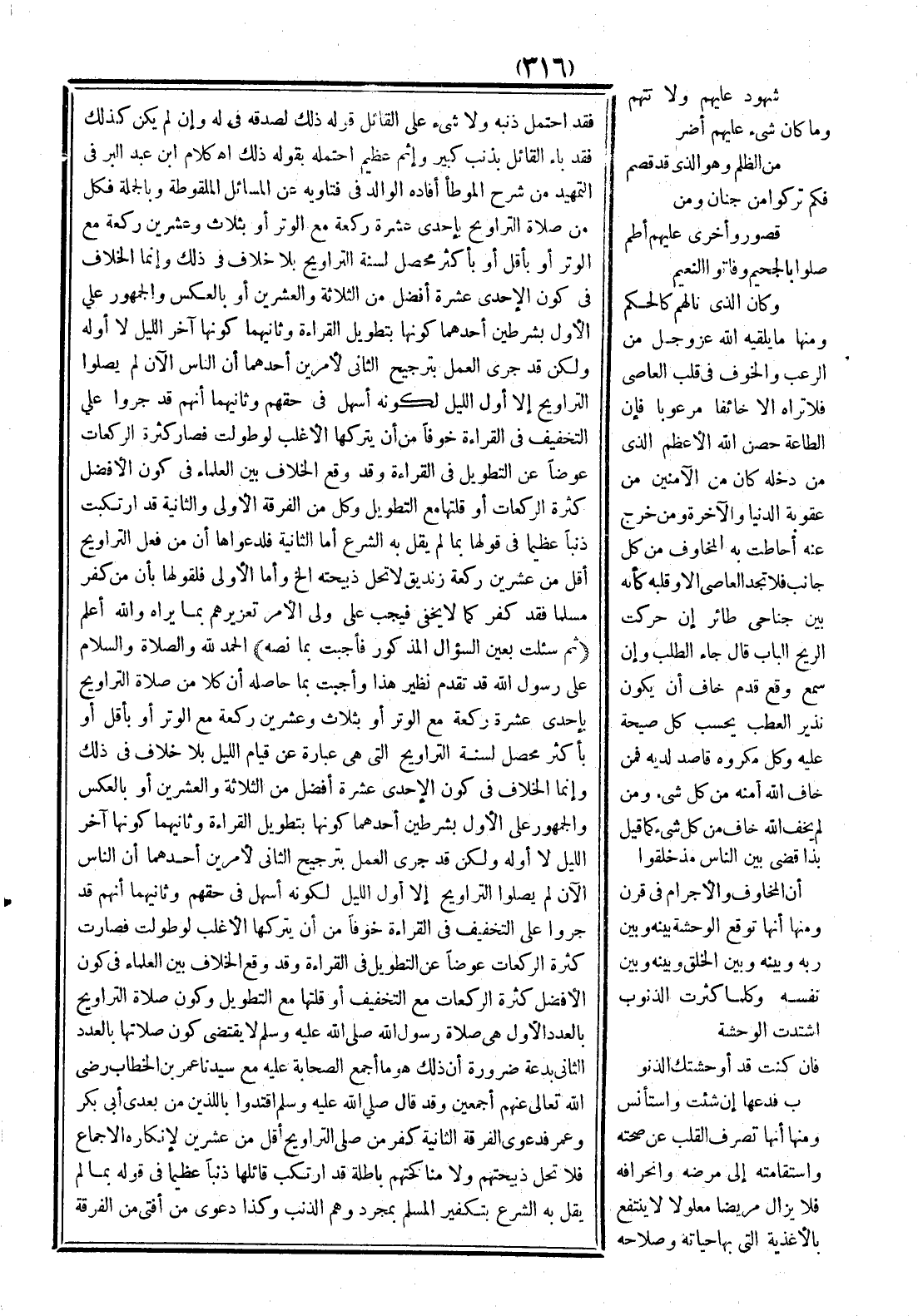 فقد احتمل ذنبه ولا شيء على القائل قوله ذلك لصدقه في قوله، وإن لم يكن كذلك فقد باء القائل بذنب كبير وإثم عظيم احتمله بقوله ذلك. اهـ. كلام ابن عبد البر في التمهيد من شرح الموطأ، أفاده الوالد في فتاويه عن المسائل الملقوطة، وبالجملة فكل من صلاة التراويح بإحدى عشرة ركعة مع الوتر أو بثلاث وعشرين ركعة مع الوتر، أو بأقل أو بأكثر محصل لسنة التراويح بلا خلاف في ذلك، وإنما الخلاف في كون الإحدى عشرة أفضل من الثلاثة والعشرين أو بالعكس، والجمهور على الأول بشرطين: أحدهما: كونها بتطويل القراءة، وثانيهما: كونها آخر الليل لا أوله، ولكن قد جرى العمل بترجيح الثاني لأمرين: أحدهما: أن الناس الآن لم يصلوا التراويح إلا أول الليل؛ لكونه أسهل في حقهم، وثانيهما: أنهم قد جروا على التخفيف في القراءة خوفًا من أن يتركها الأغلب لو طولت، فصار كثرة الركعات عوضًا عن التطويل في القراءة، وقد وقع الخلاف بين العلماء في كون الأفضل كثرة الركعات أو قلتها مع التطويل، وكل من الفرقة الأولى والثانية قد ارتكبت ذنبًا عظيمًا في قولها بما لم يقل به الشرع، أما الثانية: فلدعواها أن من فعل التراويح أقل من عشرين ركعة زنديق لا تحل ذبيحته ... إلخ، وأما الأولى: فلقولها بأن من كفر مسلمًا فقد كفر كما لا يخفى، فيجب على ولي الأمر تعزيرهم بما يراه والله أعلم.