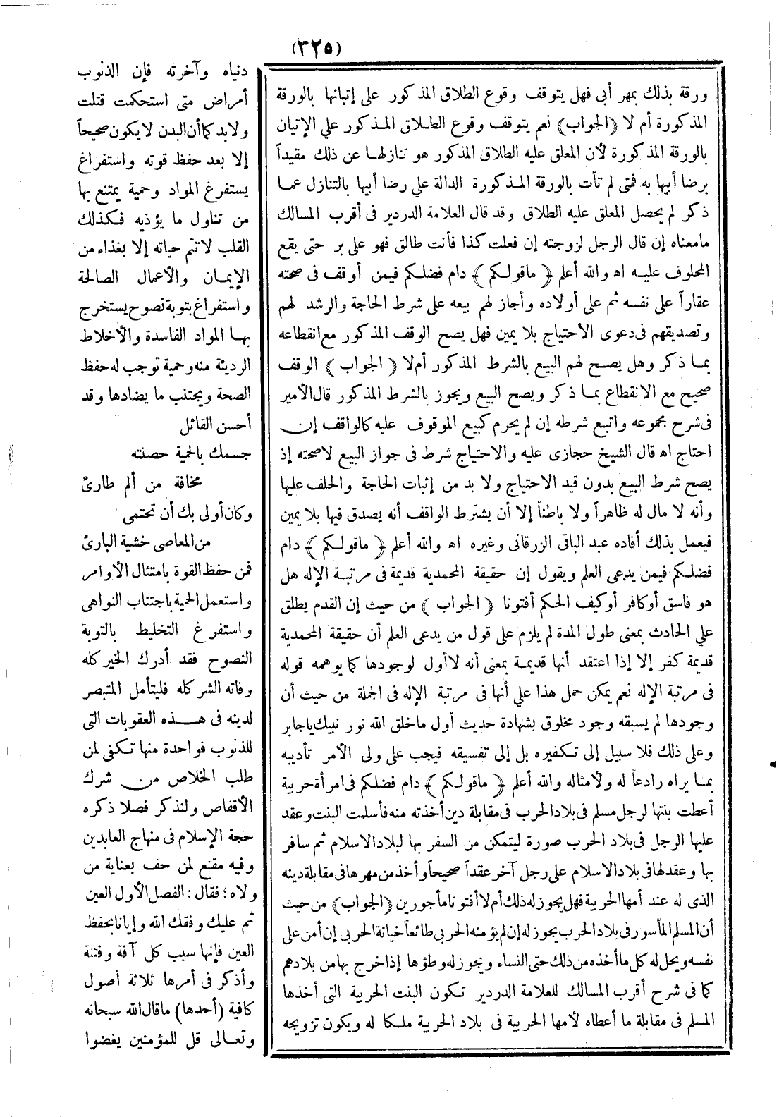 من حيث إن القدم يطلق على الحادث بمعنى طول المدة لم يلزم على قول من يدعي العلم أن حقيقة المحمدية قديمة كفر إلا إذا اعتقد أنها قديمة بمعنى أنه لا أول لوجودها كما يوهمه قوله في مرتبة الإله، نعم يمكن حمل هذا على أنها في مرتبة الإله في الجملة، من حيث إن وجودها لم يسبقه وجود مخلوق بشهادة حديث:» أول ما خلق الله نور نبيك يا جابر «وعلى ذلك فلا سبيل إلى تكفيره بل إلى تفسيقه، فيجب على ولي الأمر تأديبه بما يراه رادعًا له ولأمثاله، والله أعلم.
