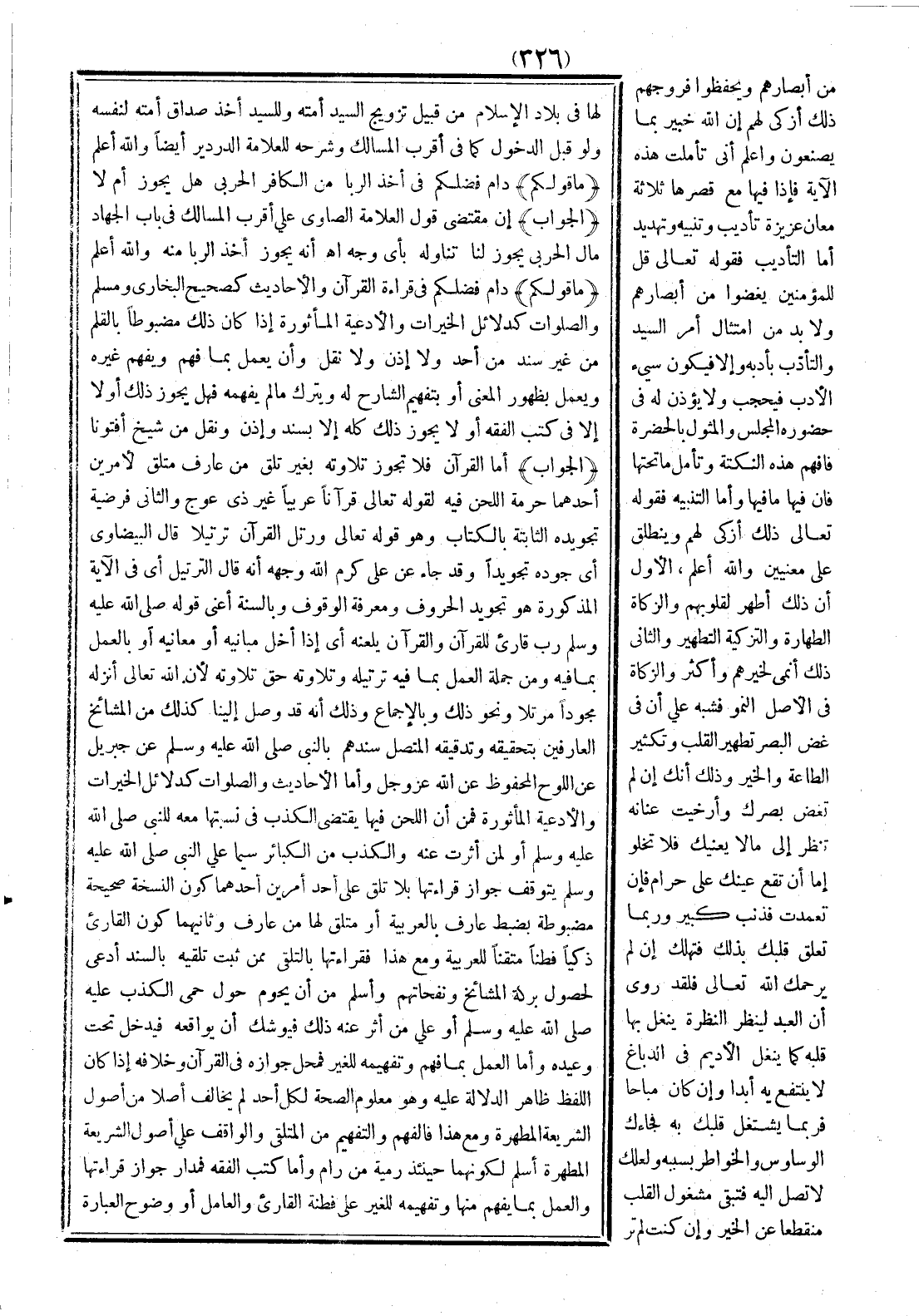 (ما قولكم) دام فضلكم في قراءة القرآن والأحاديث كصحيح البخاري ومسلم والصلوات كدلائل الخيرات والأدعية المأثورة، إذا كان ذلك مضبوطًا بالقلم من غير سند من أحد ولا إذن ولا نقل، وأن يعمل بما فهم ويفهم غيره، ويعمل بظهور المعنى، أو بتفهيم الشارح له، ويترك ما لم يفهمه، فهل يجوز ذلك أو لا إلا في كتب الفقه، أو لا يجوز ذلك كله إلا بسند وإذن ونقل من شيخ؟ أفتونا.