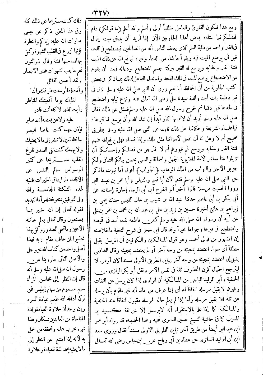 (ما قولكم) دام فضلكم فيما اعتاده بعض أهلنا الجاويين الآن إذا أريد أن يدفن ميت ينزل في القبر واحد من طلبة العلم الذي يعتقد الناس أنه من الصالحين، فيضطجع في اللحد قبل أن يوضع الميت فيه، ويقرأ ما شاء من الدعاء وغيره ليرفع الله عن ذلك الميت فتنة القبر وعذابه، ويوسع له القبر ببركة جسم المضطجع ودعائه، فبعد أن يقوم من الاضطجاع يوضع الميت في ذلك اللحد، واستدل الفاعل لذلك بما ذكر في بعض كتب الجاوية من أن الحافظ أبا نعيم روى أن النبي -صلى الله عليه وسلم- نزل في قبر فاطمة بنت أسد والدة سيدنا علي -رضي الله تعالى عنه- ونزع ثيابه واضطجع في لحدها قبل دفنها، ثم خرج رسول الله -صلى الله عليه وسلم- فسئل عن ذلك فقال -صلى الله عليه وسلم-:» أريد أن لا تمسها النار أبدًا إن شاء الله وأن يوسع لها قبرها «، فيا علماء الشريعة وحكمائها هل ذلك ثابت عن النبي -صلى الله عليه وسلم- بطريق صحيح أم لا؟ وهل لنا أن نفعل لأمواتنا مثل ذلك؟ وإذا فعلناه فهل يرفع الله عنهم فتنة القبر وعذابه ويوسع لهم قبورهم أم لا؟ فنرجو من فضلكم وإحسانكم أن تزيلوا عنا معاشر الأمة الملايوية الجهل والحماقة والعمى بحسن بيانكم الشافي، ولكم جزيل الأجر والثواب من الملك الوهاب.