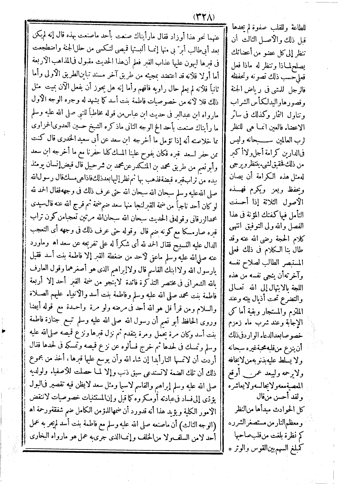 عنهما- نحو هذا، أو زاد فقال: ما رأيناك صنعت بأحد ما صنعت بهذه، قال:» إنه لم يكن بعد أبي طالب أبر بي منها، إنما ألبستها قميصي لتكسى من حلل أهل الجنة، واضطجعت في قبرها ليهون عليها عذاب القبر «فعلم أن هذا الحديث مقبول في المذاهب الأربعة، أما أولاً فلأنه قد اعتضد بمجيئه من طريق آخر مسند تباين الطريق الأولى، وأما ثانيًا: فلأنه لم يعلم حال راويه فافهم، وأما إنه هل يجوز أن يفعل الآن بميت مثل ذلك فلا؛ لأنه من خصوصيات فاطمة بنت أسد، كما يشهد له وجوه الوجه الأول ما رواه ابن عبد البر في حديث ابن عباس من قوله مخاطبًا للنبي -صلى الله عليه وسلم- ما رأيناك صنعت بأحد ... الخ، الوجه الثاني: ما ذكره الشيخ حسين العدوي الحمزاوي مما خلاصته أنه إذا تؤمل ما أخرجه ابن سعد عن أبي سعيد الخدري قال: كنت ممن حفر لسعد قبره، فكان يفوح علينا المسك كلما حفرنا، مع ما أخرجه ابن سعد وأبو نعيم من طريق محمد بن المنكدر عن محمد بن شرحبيل قال: قبض إنسان يومئذ بيده من تراب قبره قبضة فذهب بها ثم نظر إليها بعد ذلك فإذا هي مسك، قال رسول الله -صلى الله عليه وسلم-:» سبحان الله سبحان الله «حتى عرف ذلك في وجهه فقال» الحمد لله، لو كان أحد ناجيًا من ضمة القبر لنجا منها سعد ضم ضمة ثم فرج الله عنه «قال سيدي محمد الزرقاني: وقوله في الحديث سبحان الله سبحان الله مرتين تعجبًا من كون تراب قبره صار مسكا مع كونه ضم قال: وقوله "حتى عرف ذلك في وجهه" أي التعجب الدال عليه التسبيح، فقال الحمد لله أي شكرًا له على تفريجه عن سعد. اهـ. وما ورد عنه -صلى الله عليه وسلم-» ما عفي لأحد من ضغطة القبر إلا فاطمة بنت أسد فقيل: يا رسول الله ولا ابنك القاسم قال: ولا إبراهيم الذي هو أصغرهما «وقول العارف بالله الشعراني في مختصر التذكرة فائدة: لا ينجو من ضمة القبر أحد إلا أربعة: فاطمة بنت محمد -صلى الله عليه وسلم- وفاطمة بنت أسد، والأنبياء عليهم الصلاة والسلام، ومن قرأ قل هو الله أحد في مرضه ولو مرة واحدة مع قوله أيضًا، وروى الحافظ أبو نعيم» أن رسول الله -صلى الله عليه وسلم- تبع جنازة فاطمة بنت أسد وكان مرة يحمل ومرة يتقدم ثم نزل قبرها ونزع قميصه -صلى الله عليه وسلم- وتمسك في لحدها ثم خرج فسألوه عن نزع قميصه وتمسكه في لحدها فقال: أردت أن لا تمسها النار أبدًا إن شاء الله وأن يوسع عليها قبرها «، أخذ من مجموع ذلك أن تلك الضمة لا تستدعي سبق ذنب، وإلا لما حصلت للأصفياء ولولديه -صلى الله عليه وسلم- إبراهيم والقاسم، لا سيما ومثل سعد لا يظن فيه تقصير في البول يؤدي إلى فساد في عبادته، أو مكروه كما قيل، وأن المستثنيات خصوصيات لا تنقض الأمور الكلية، ويؤيد هذا أنه قد ورد أن ضمها للمؤمن الكامل ضم شفقة ورحمة اهـ.
