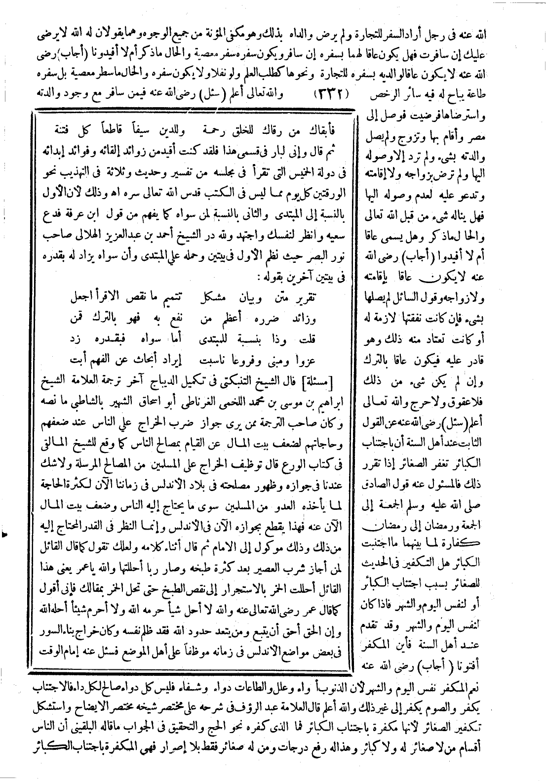 ثم قال: وإني لبار في قسمي هذا، فلقد كنت أفيد من زوائد إلقائه وفوائد إبدائه في دولة الخميس التي تقرأ في مجلسه من تفسير وحديث، وثلاثة في التهذيب نحو الورقتين كل يوم مما ليس في الكتب قدس الله تعالى سره. اهـ. وذلك لأن الأول بالنسبة إلى المبتدي، والثاني بالنسبة لمن سواه كما يفهم من قول ابن عرفة، فدع سعيه وانظر لنفسك واجتهد، ولله در الشيخ أحمد بن عبد العزيز الهلالي صاحب نور البصر، حيث نظم الأول في بيتين، وحمله على المبتدي، وأن سواه يزاد له بقدره في بيتين آخرين، بقوله:
