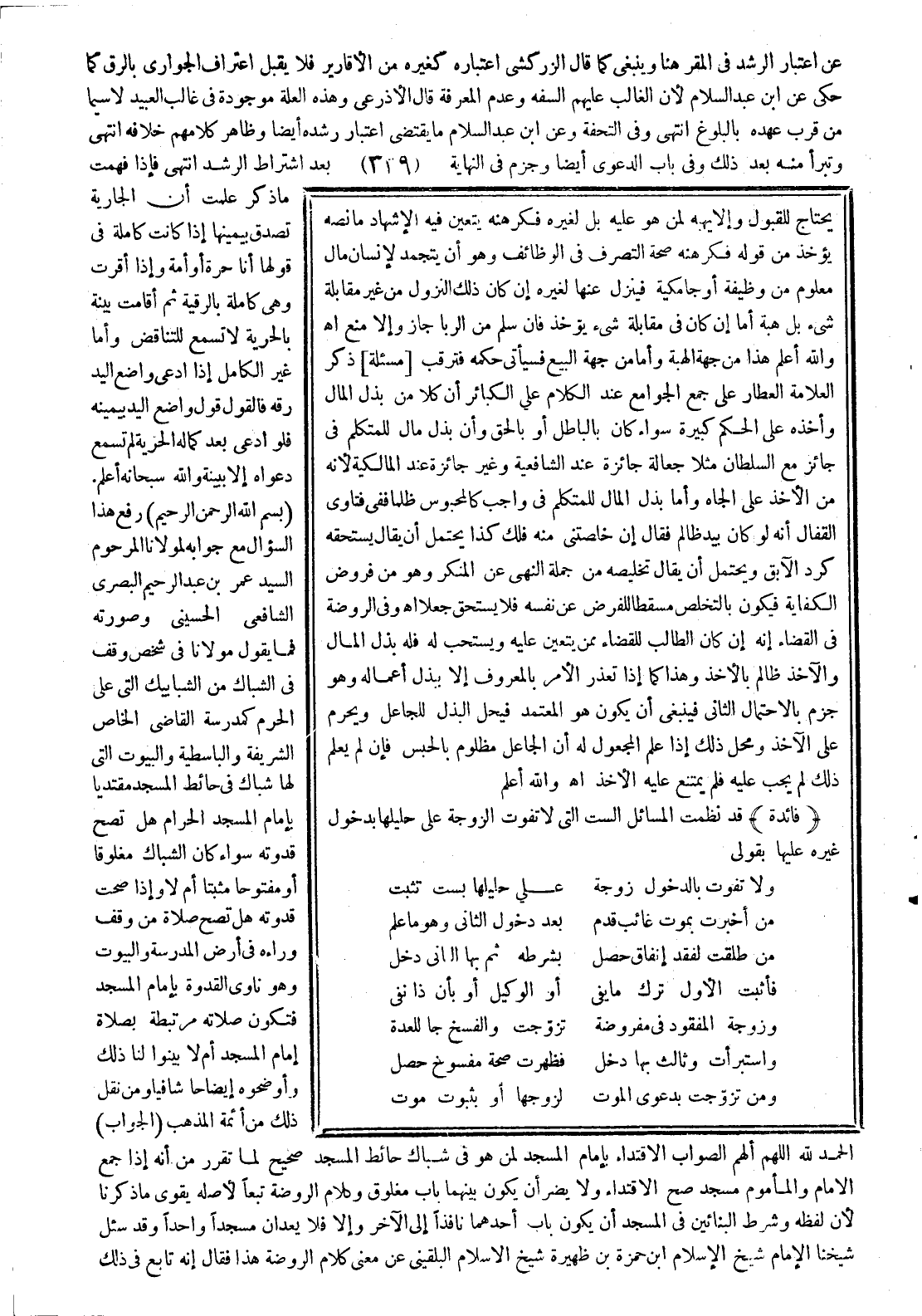 (فائدة) قد نظمت المسائل الست التي لا تفوت الزوجة على حليلها بدخول غيره عليها بقولي: