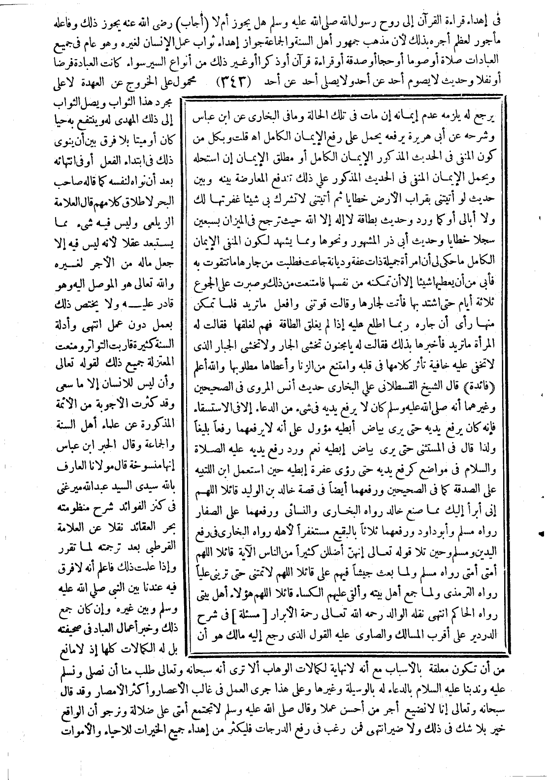 (فائدة) قال الشيخ القسطلاني على البخاري حديث أنس المروي في الصحيحين وغيرهما، أنه صلى الله عليه وسلم كان لا يرفع يديه في شيء من الدعاء إلا في الاستسقاء، فإنه كان يرفع يديه حتى يرى بياض أبطيه مؤول على أنه لا يرفعهما رفعا بليغا، ولذا قال في المستثنى حتى يرى بياض إبطيه، نعم ورد رفع يديه عليه الصلاة والسلام في مواضع كرفع يديه حتى رئي عفرة إبطيه حين استعمل ابن اللتبية على الصدقة كما في الصحيحين، ورفعهما أيضا في قصة خالد بن الوليد، قائلا: "إني أبرأ إليك مما صنع خالد"، رواه البخاري والنسائي ورفعهما على الصفار، رواه مسلم وأبو داود، ورفعهما ثلاثا بالبقيع مستغفرا لأهله رواه البخاري في رفع اليدين، ومسلم، وحين تلا قوله تعالى:} إِنَّهُنَّ أَضْلَلْنَ كَثِيرا مِنَ النَّاسِ {الآية، قائلا: "اللهم أمتي أمتي" رواه مسلم، ولما بعث جيشا فيهم علي قائلا: "اللهم لا تمتني حتى تريني عليا" رواه الترمذي، ولما جمع أهل بيته وألقى عليهم الكساء قائلا: "اللهم هؤلاء أهل بيتي" رواه الحاكم. انتهى نقله الوالد رحمه الله تعالى رحمة الأبرار.