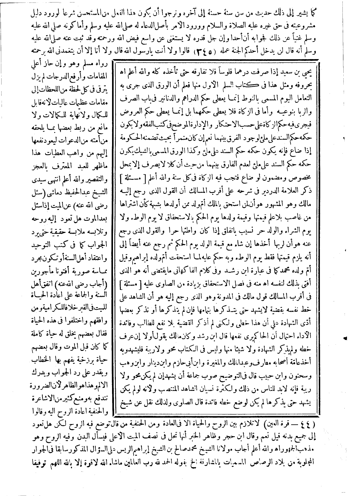 يحيى بن سعيد إذا صرفت درهما فلوسا، فلا تفارقه حتى تأخذه كله، والله أعلم. اهـ. بحروفه، ومثل هذا في كتاب السلم الأول منها، فعلم أن الورق الذي جرى به التعامل اليوم، المسمى بالنوط إنما يعطى حكم الدراهم والدنانير في باب الصرف والربا بنوعيه، وأما في الزكاة فلا يعطى حكمهما، بل إنما يعطى حكم العروض؛ فيجري فيه حكم الزكاة على حسب الاحتكار والإدارة الموضح في كتب الفقه، ولا يكون حكمه حكم السند على مليء لوجود الفرق بينهما، نعم إن كان منمرا بحيث تضمنه الحكومة؛ إذا ضاع فإنه يكون حكمه حكم السند على مليء، وكذا الورق المسمى بالشيك يكون حكمه حكم السند على مليء لعدم الفارق بينهما من حيث إن كلا لا يصرف إلا بمحل مخصوص ومضمون لو ضاع، فتجب فيه الزكاة في كل سنة، والله أعلم.