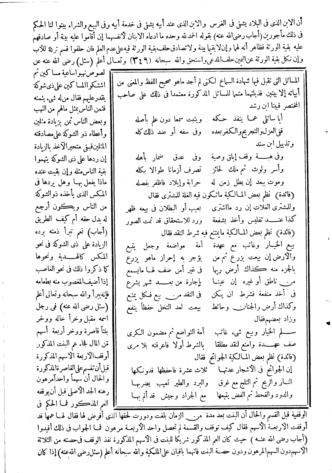 المسائل التي تقبل فيها شهادة السماع، لكني لم أجد ما هو صحيح اللفظ والمعنى من أبياته إلا بيتين، فذيلتهما متمما للمسائل المذكورة معتمدا في ذلك على صاحب المختصر، فبيتا ابن رشد: