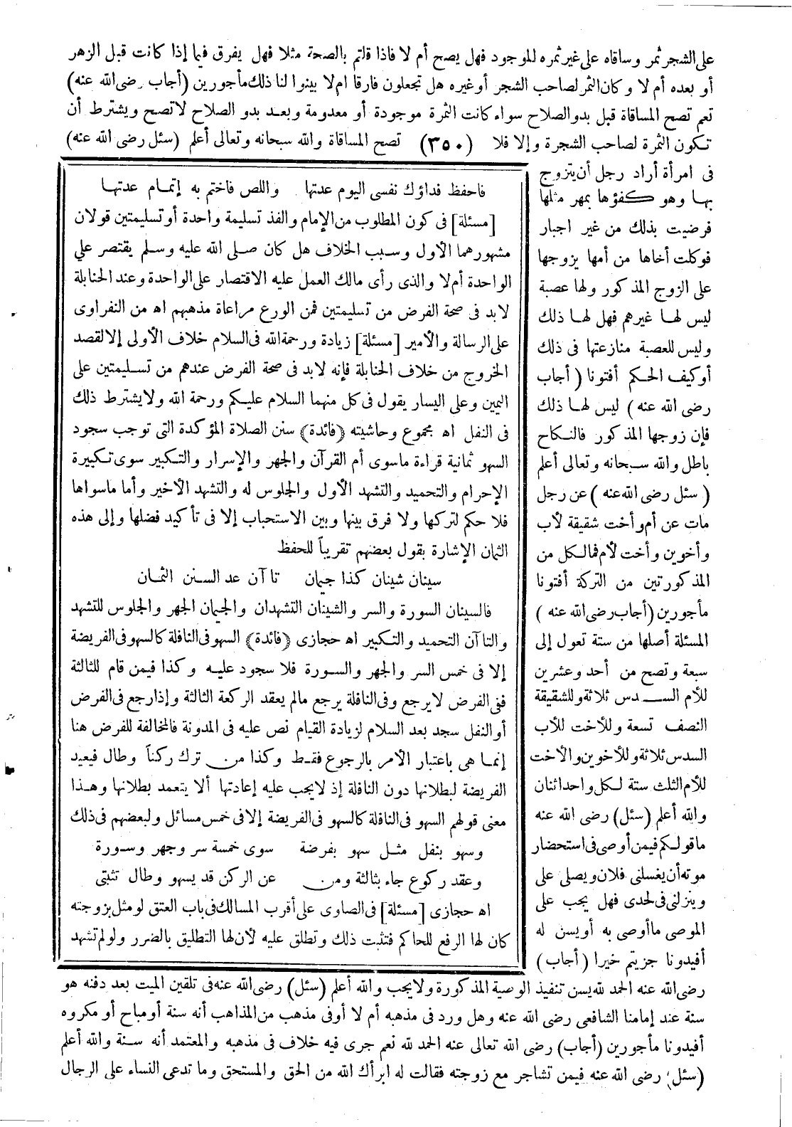 (فائدة) السهو في النافلة كالسهو في الفريضة إلا في خمس السر والجهر، والسورة فلا سجود عليه، وكذا فيمن قام للثالثة ففي الفرض لا يرجع، وفي النافلة يرجع ما لم يعقد الركعة الثالثة، وإذا رجع في الفرض أو النفل سجد بعد السلام لزيادة القيام نص عليه في المدونة، فالمخالفة للفرض هنا إنما هي باعتبار الأمر بالرجوع فقط، وكذا من ترك ركنا، وطال فيعيد الفريضة لبطلانها دون النافلة، إذ لا يجب عليه إعادتها ألا يتعمد بطلانها، وهذا معنى قولهم السهو في النافلة كالسهو في الفريضة إلا في خمس مسائل، ولبعضهم في ذلك: