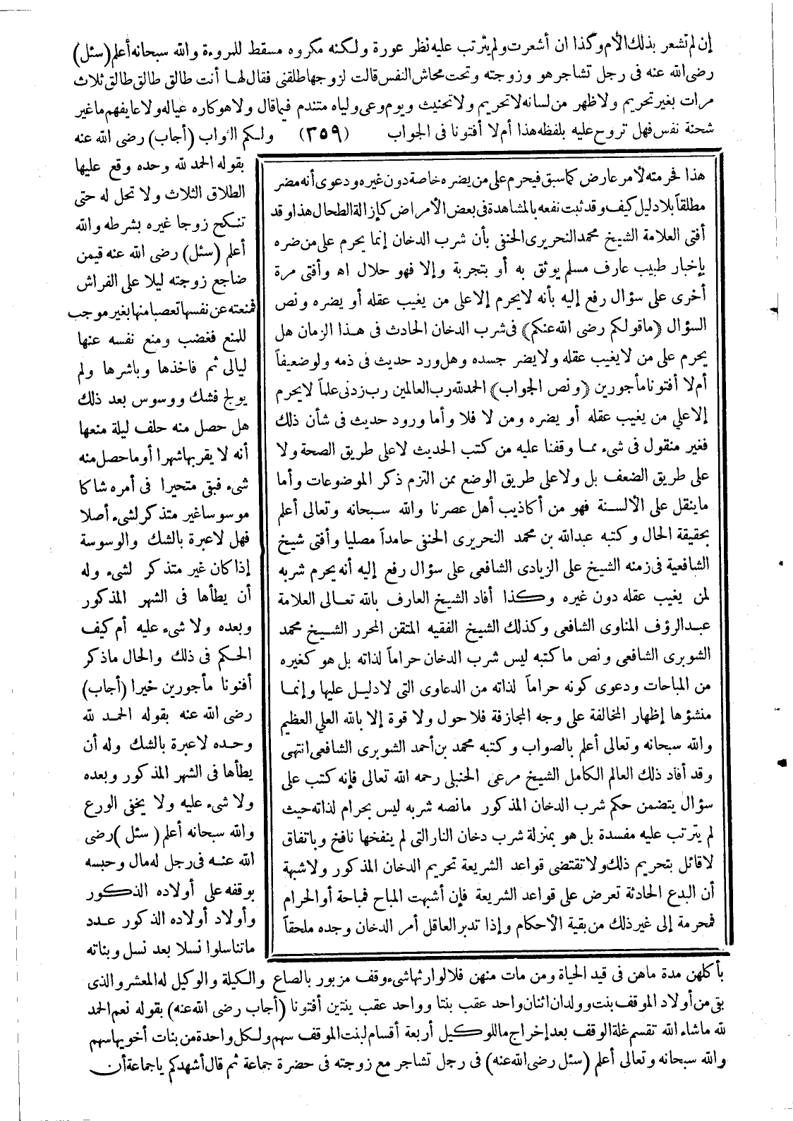 الحمد لله رب العالمين، رب زدني علما، لا يحرم إلا على من يغيب عقله أو يضره، ومن لا فلا، وأما ورود حديث في شأن ذلك، فغير منقول في شيء مما وقفنا عليه من كتب الحديث لا على طريق الصحة، ولا على طريق الضعف، بل ولا على طريق الوضع ممن التزم ذكر الموضوعات، وأما ما ينقل على الألسنة فهو من أكاذيب أهل عصرنا، والله سبحانه وتعالى أعلم بحقيقة الحال، وكتبه عبد الله بن محمد النحريري الحنفي حامدا مصليا، وأفتى شيخ الشافعية في زمنه الشيخ علي الزيادي الشافعي على سؤال رفع إليه أنه يحرم شربه لمن يغيب عقله دون غيره، وكذا أفاد الشيخ العارف بالله تعالى العلامة عبد الرءوف المناوي الشافعي، وكذلك الشيخ الفقيه المتقن المحرر الشيخ محمد الشوبري الشافعي، ونص ما كتبه ليس شرب الدخان حراما لذاته، بل هو كغيره من المباحات ودعوى كونه حراما لذاته من الدعاوى التي لا دليل عليها، وإنما منشؤها إظهار المخالفة على وجه المجازفة، فلا حول ولا قوة إلا بالله العلي العظيم، والله سبحانه وتعالى أعلم بالصواب، وكتبه محمد بن أحمد الشوبري الشافعي. انتهى.