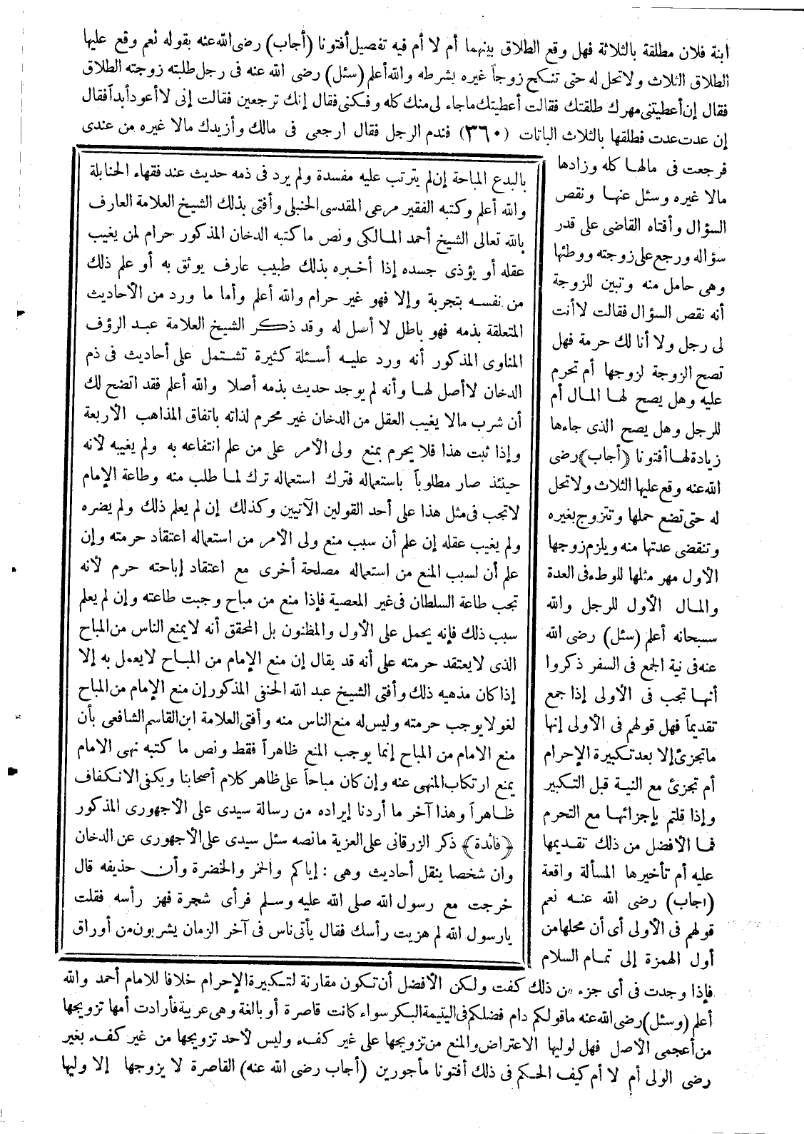 بالبدع المباحة إن لم يترتب عليه مفسدة، ولم يرد في ذمه حديث عند فقهاء الحنابلة، والله أعلم، وكتبه الفقير مرعي المقدسي الحنبلي، وأفتى بذلك الشيخ العلامة العارف بالله تعالى الشيخ أحمد المالكي، ونص ما كتبه الدخان المذكور حرام لمن يغيب عقله، أو يؤذي جسده إذا أخبره بذلك طبيب عارف يوثق به، أو علم ذلك من نفسه بتجربة، وإلا فهو غير حرام، والله أعلم، وأما ما ورد من الأحاديث المتعلقة بذمه، فهو باطل لا أصل له، وقد ذكر الشيخ العلامة عبد الرءوف المناوي المذكور، أنه ورد عليه أسئلة كثيرة تشتمل على أحاديث في ذم الدخان لا أصل لها، وأنه لم يوجد حديث بذمه أصلا، والله أعلم.