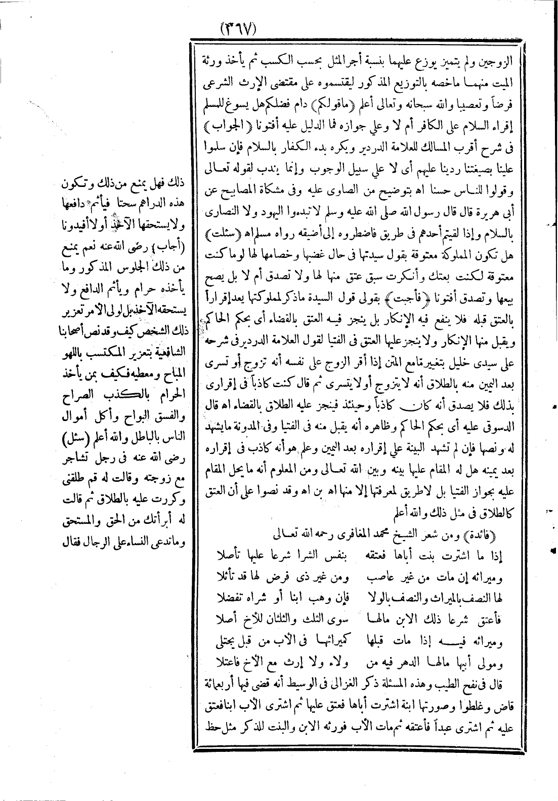 (فأجبت) بقولي: قول السيدة ما ذكر لمملوكتها يعد إقرارا بالعتق قبله، فلا ينفع فيه الإنكار، بل ينجز فيه العتق بالقضاء أي بحكم الحاكم، ويقبل منها الإنكار، ولا ينجز عليها العتق في الفتيا؛ لقول العلامة الدردير في شرحه على سيدي خليل بتغيير ما مع المتن إذا أقر الزوج على نفسه أنه تزوج أو تسرى بعد اليمين منه بالطلاق أنه لا يتزوج أو لا يتسرى، ثم قال: كنت كاذبا في إقراري بذلك، فلا يصدق أنه كان كاذبا، وحينئذ فينجز عليه الطلاق بالقضاء اهـ. قال الدسوقي: عليه أي بحكم الحاكم، وظاهره أنه يقبل منه، في الفتيا، وفي المدونة ما يشهد له، ونصها فإن لم تشهد البينة على إقراره بعد اليمين، وعلم هو أنه كاذب في إقراره بعد يمينه هل له المقام عليها بينه وبين الله تعالى، ومن المعلوم أنه ما يحل المقام عليه بجواز الفتيا، بل لا طريق لمعرفتها إلا منها. اهـ، بن اهـ، وقد نصوا على أن العتق كالطلاق في مثل ذلك، والله أعلم.