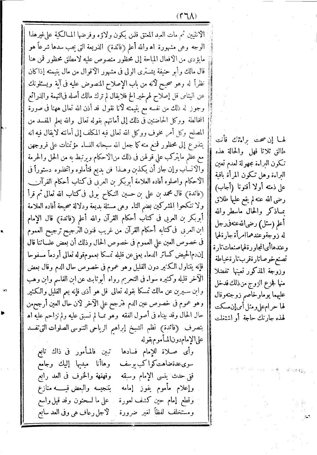 (فائدة) قال محمد بن علي بن حسين: النكاح بولي في كتاب الله تعالى ثم قرأ:} وَلَا تُنْكِحُوا الْمُشْرِكِينَ {بضم التاء، وهي مسألة بديعة ودلالة صحيحة، أفاده العلامة أبو بكر بن العربي في كتاب أحكام القرآن، والله أعلم.
