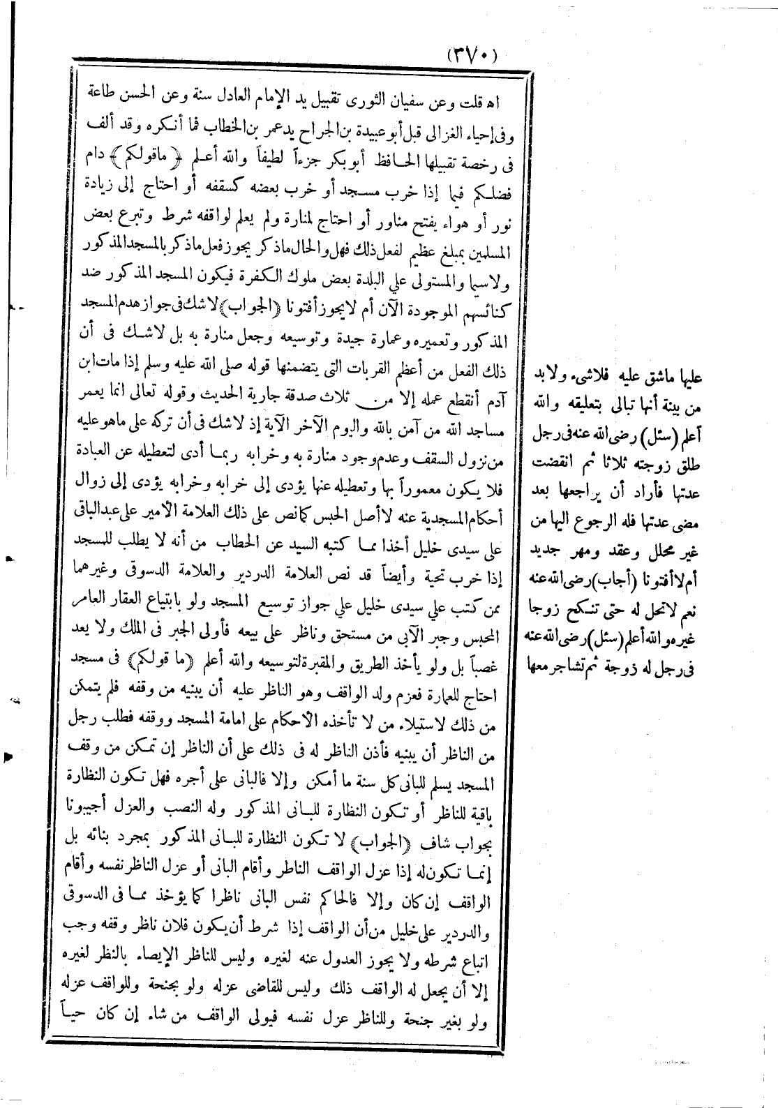لا شك في جواز هدم المسجد المذكور وتعميره، وعمارة جيدة وتوسيعه، وجعل منارة به بل لا شك في أن ذلك الفعل من أعظم القربات التي يتضمنها قوله صلى الله عليه وسلم: "إذا مات ابن آدم انقطع عمله إلا من ثلاث: صدقة جارية ... " الحديث، وقوله تعالى:} إِنَّمَا يَعْمُرُ مَسَاجِدَ اللَّهِ مَنْ آمَنَ بِاللَّهِ وَالْيَوْمِ الْآخِرِ {الآية، إذ لا شك في أن تركه على ما هو عليه من نزول السقف، وعدم وجود منارة به، وخرابه ربما أدى لتعطيله عن العبادة، فلا يكون معمورا بها، وتعطيله عنها يؤدي إلى خرابه، وخرابه يؤدي إلى زوال أحكام المسجدية عنه، لا أصل الحبس كما نص على ذلك العلامة الأمير على عبد الباقي على سيدي خليل، أخذا مما كتبه السيد عن الحطاب من أنه لا يطلب للمسجد إذا خرب تحية، وأيضا قد نص العلامة الدردير، والعلامة الدسوقي وغيرهما ممن كتب على سيدي خليل على جواز توسيع المسجد، ولو بابتياع العقار العامر المحبس، وجبر الآبي من مستحق، وناظر على بيعه، فأولى الجبر في الملك ولا يعد غصبا، بل ولو يأخذ الطريق والمقبرة لتوسيعه، والله أعلم.